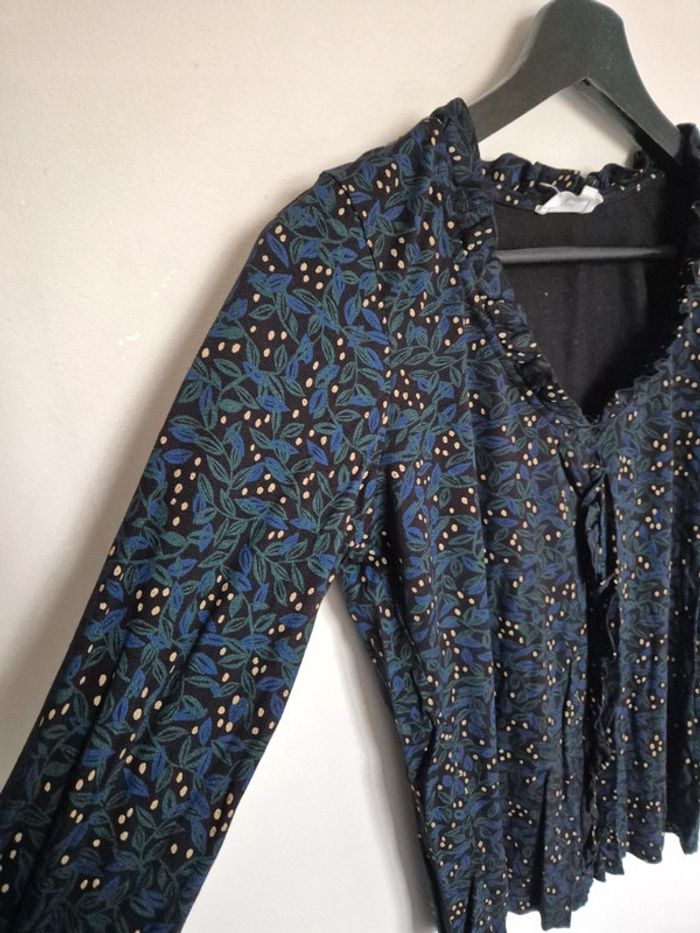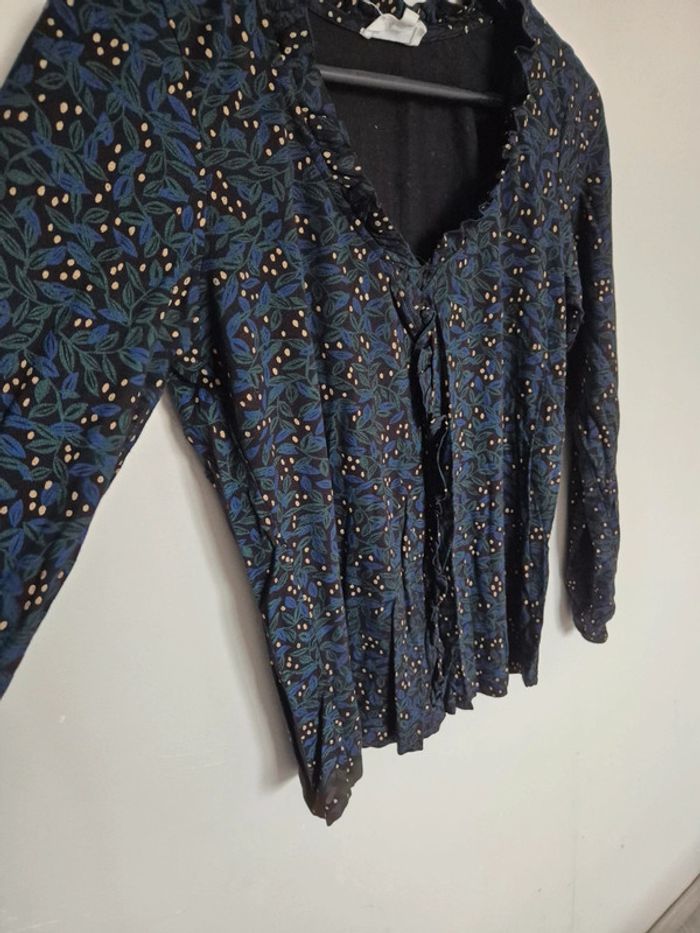 Blouse noire , bleu et jaune à motif, manche longue, ➡️Largeur à plat sous les bras 45 cm
