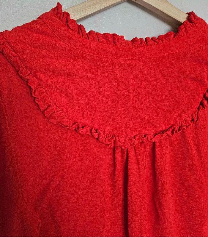 📌Lot 20% de remise dès 5 articles Blouse rouge, manche 3/4, détail froncé sur les bords, décolleté en v ➡️Largeur à plat sous les bras 50 cm ➡️Longueur 61 cm ➡️100% viscose ⭐Excellent état ✈Envoi rapide des colis 💗 Abonnez vous à mon profil, nombreux articles ajoutés régulièrement ! #laetitresors_blouse40 #blouse #rouge#manche #volant #chemisier #voile #bash #top #uni #chic #cocktail #bash