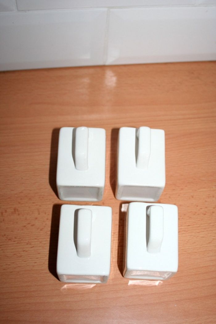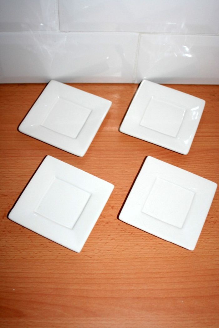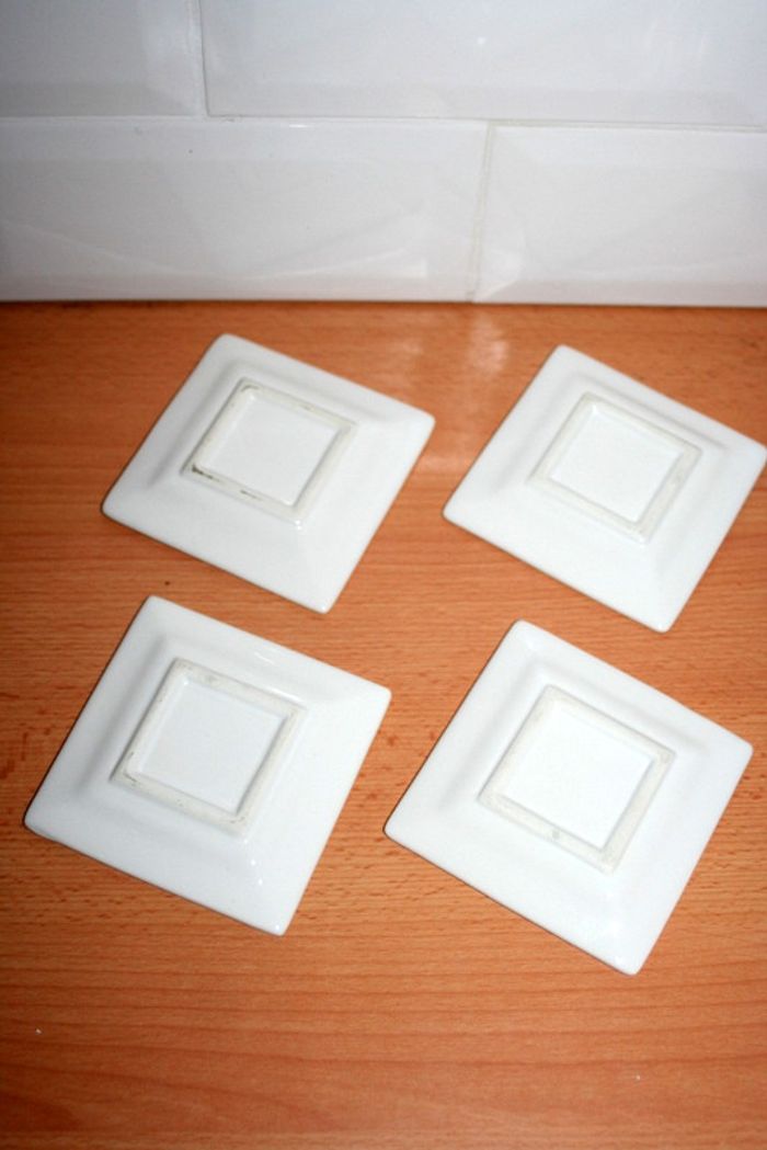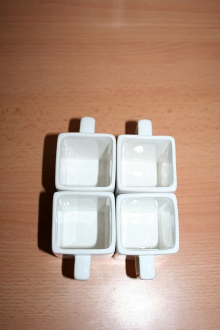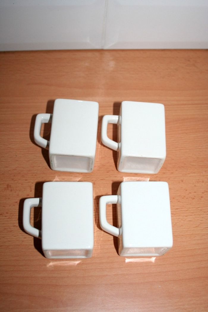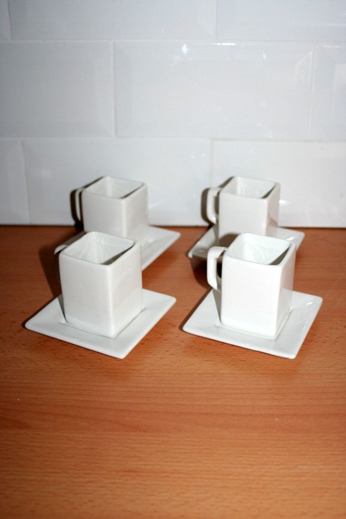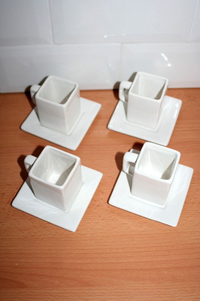 Lot de 4 tasses et soucoupes blanches, légèrement abimé mais se voit à peine, tasse : 5x5cm de côté, 6.8cm de haut, soucoupe : 9.6x9.6cm, 900g