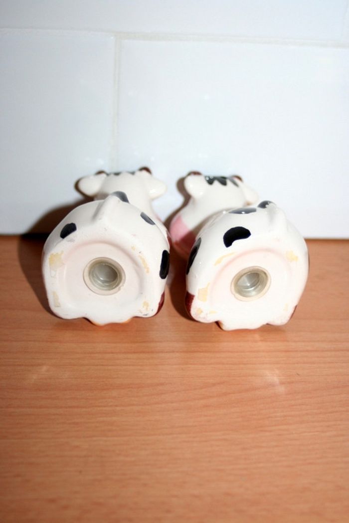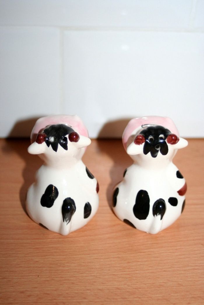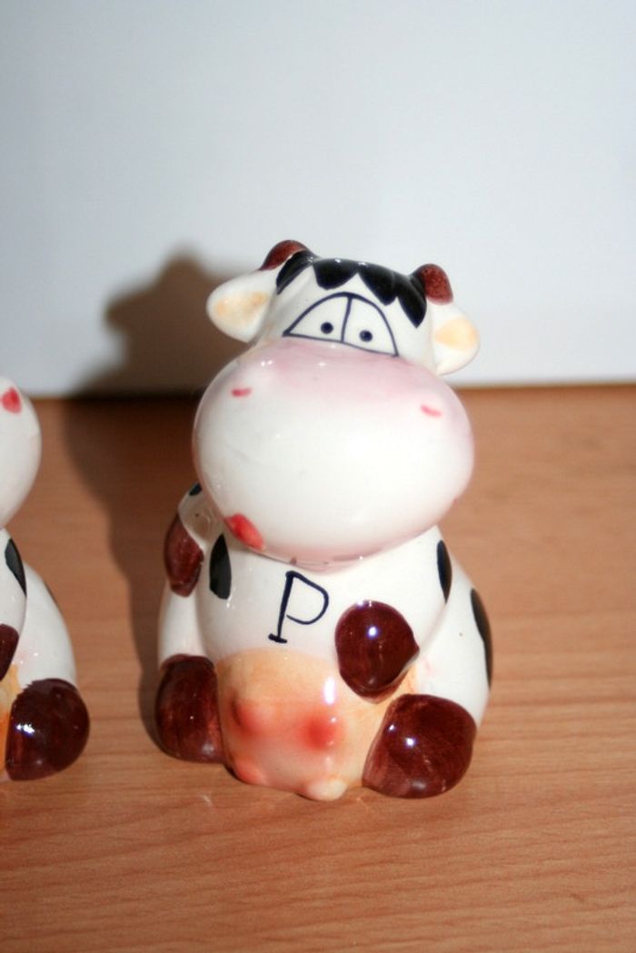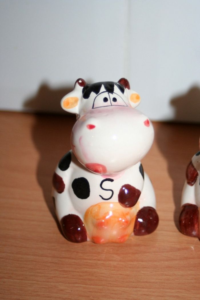 Salière/Poivrière vache, 7.8cm de haut, 5cm de large à la base, légèrement abimé sur le dessous, 40g