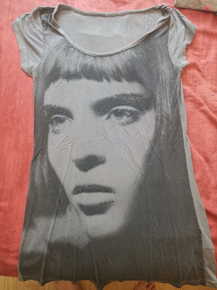 T-shirt long avec femme dessus.