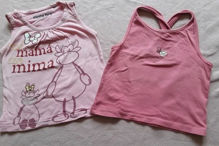 Lot de 2 jolis débardeurs pour petite fille en 3 ans (même si l'un est indiqué 4 ans, il taille petit...). L'un dos croisé est un Sergent Major avec strass. L'autre, sans marque, a un motif vaches et des strass. En bon état (une petite tache de résine je pense, au dos du Sergent Major, voir photo 2).