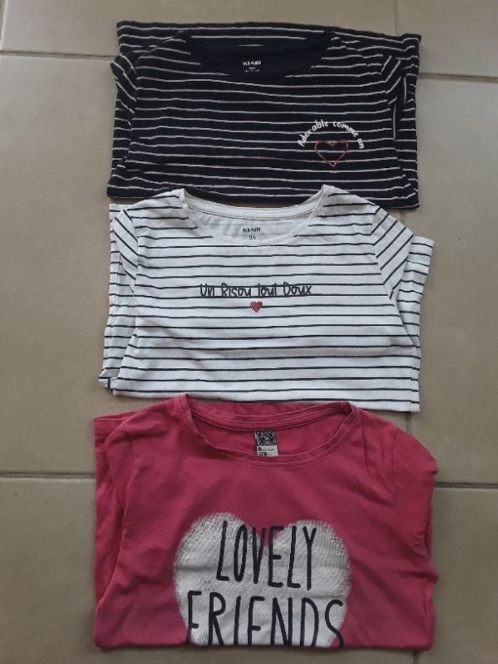 1 t-shirt fuschia TAO 2 t-shirts marinières marine et blanc KIABI. En excellent état. Taille : 8 ans.