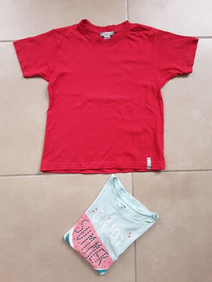 Jamais porté. Taille indiquée 8 ans mais taille grand donc plutôt 10 ans. + 1 t-shirt KIABI vert clair et pastèque avec un petit trou au niveau de l'accroche de l'étiquette (voir photo).
