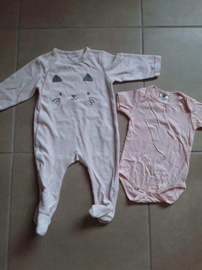 Comme neufs ! Lot comprenant : 1 body MC rose, MOTS D'ENFANTS, 1 pyjama ouverture devant et pieds anti-dérapants rose pâle motif chat, TEX.