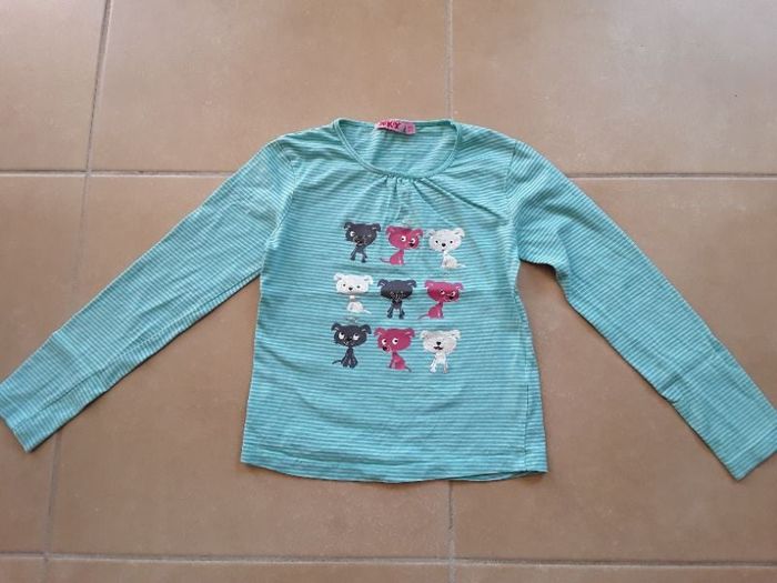 Comme neuf. Taille indiquée 10 ans mais taille vraiment petit donc plutôt 9 ans. Rayé turquoise / blanc et imprimé petits chiens.