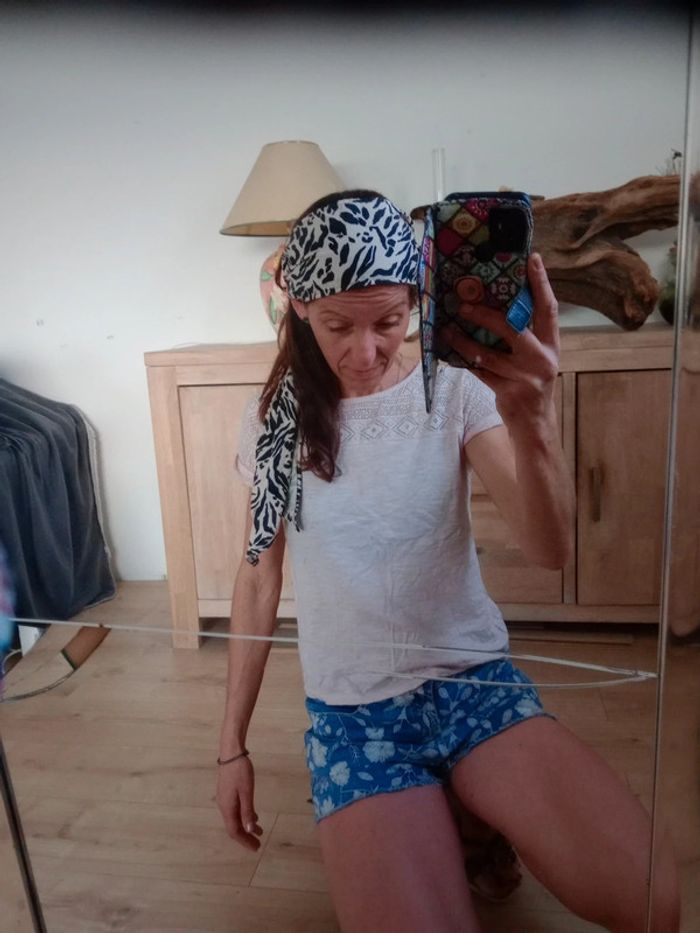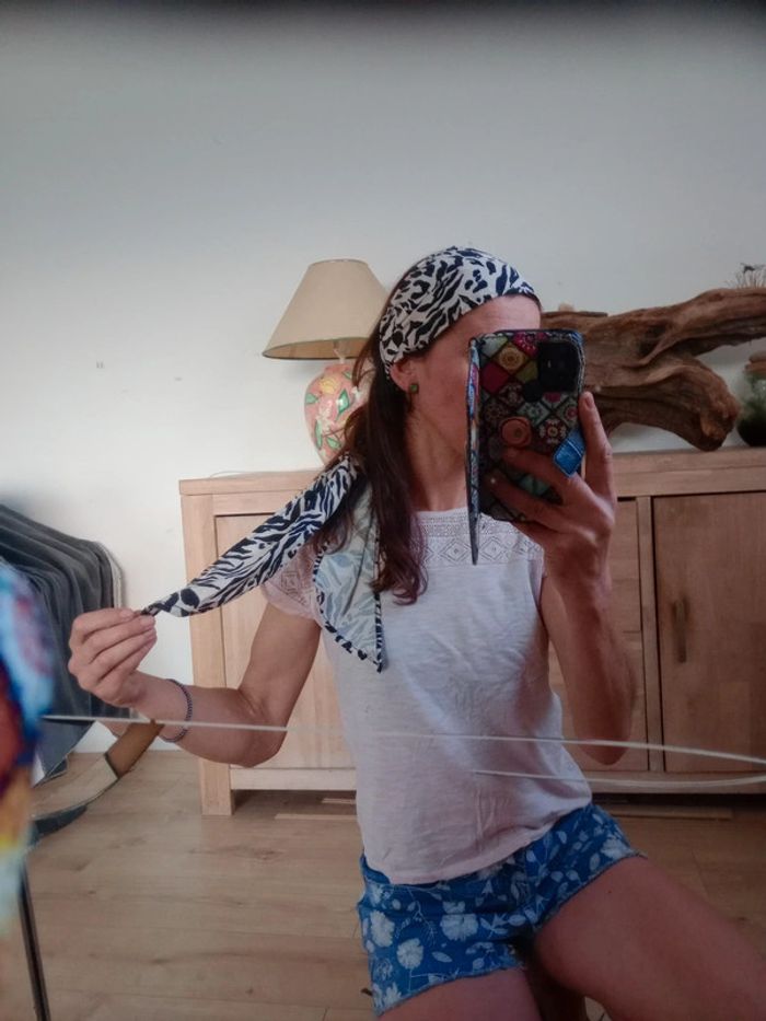 Style bohème .🥰 Joli bandeau pour cheveux avec un motif noir et beige façon animalier/floral. Tissu léger et fluide, agréable à porter, idéal pour un look bohème, décontracté ou estival. Peut se nouer de différentes façons (turban, bandeau classique, etc.). Convient à toutes les tailles grâce à son format à nouer. 🖤 État : Très bon état 📏 Dimensions : environ 140 cm biseauté dans les extrémités 🌿 Parfait pour l'été, festivals, vacances ou ajouter une touche stylée à vos tenues