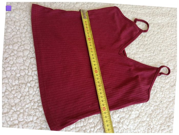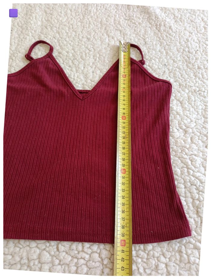 (Q) Taille XS/S. Débardeur bordeaux à fines bretelles, tissu côtelé, coupe ajustée minimaliste. #bordeaux #boho #minimaliste #y2k #été #vintage