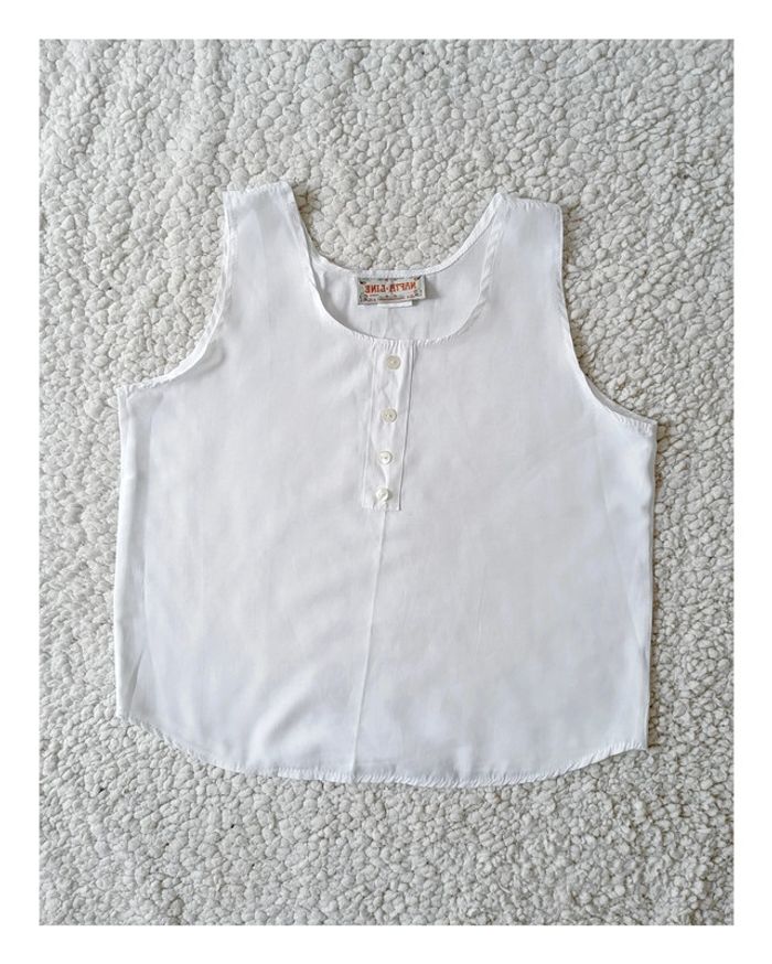 (P) Taille estime S/M, se fier aux mesures. Débardeur blanc sans manches avec patte de boutonnage à l’avant. Style vintage avec jolie coupe droite. #blanc #vintage #naftaline #boutons #retro #debardeur #été