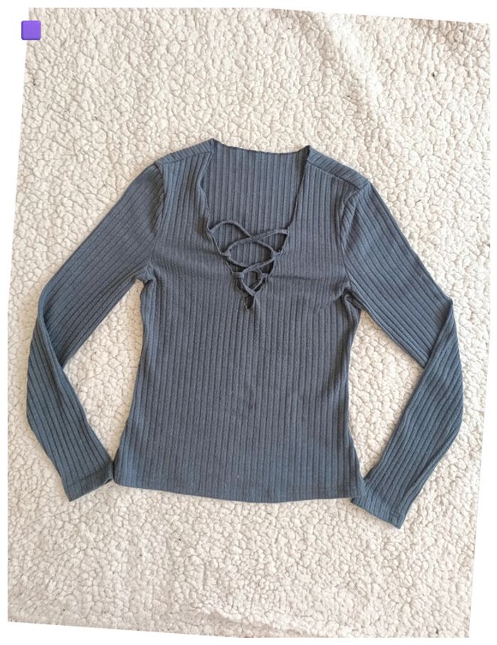 Haut gris côtelé à lacets devant – basique, y2k, manches longues - photo numéro 2