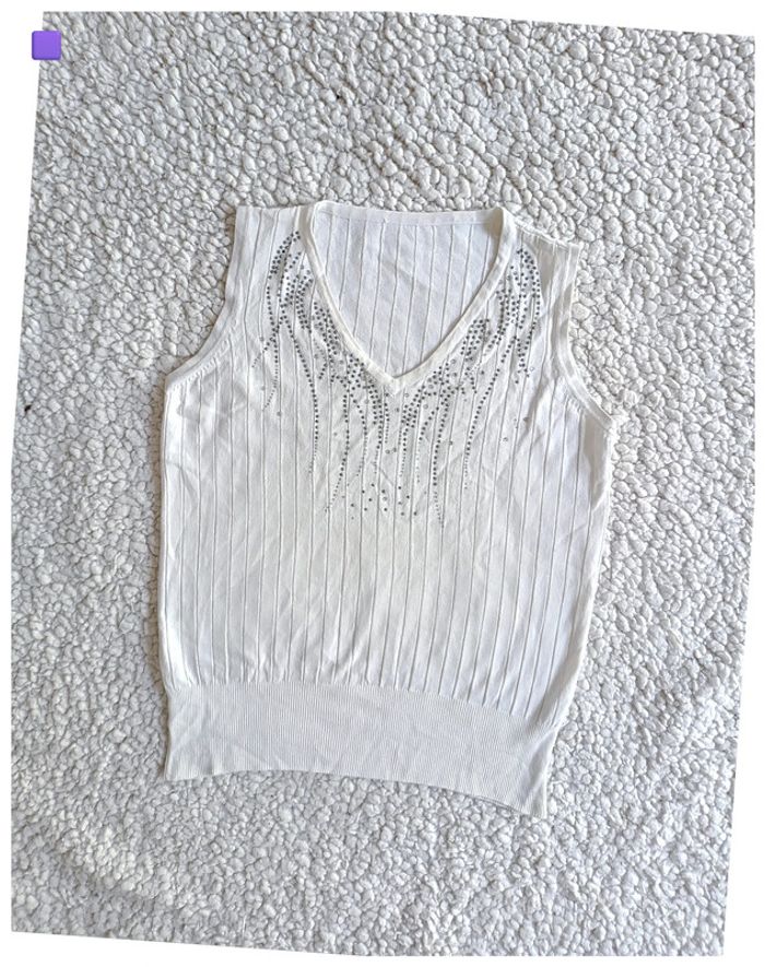 (N) Taille XS/S, voir M car estensible, se fier aux mesures Débardeur blanc à strass sur le devant, léger et élégant #débardeur #blanc #strass #été #vintage #chic #hautfemme #modeété