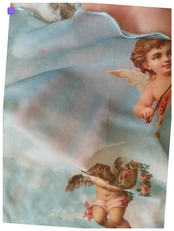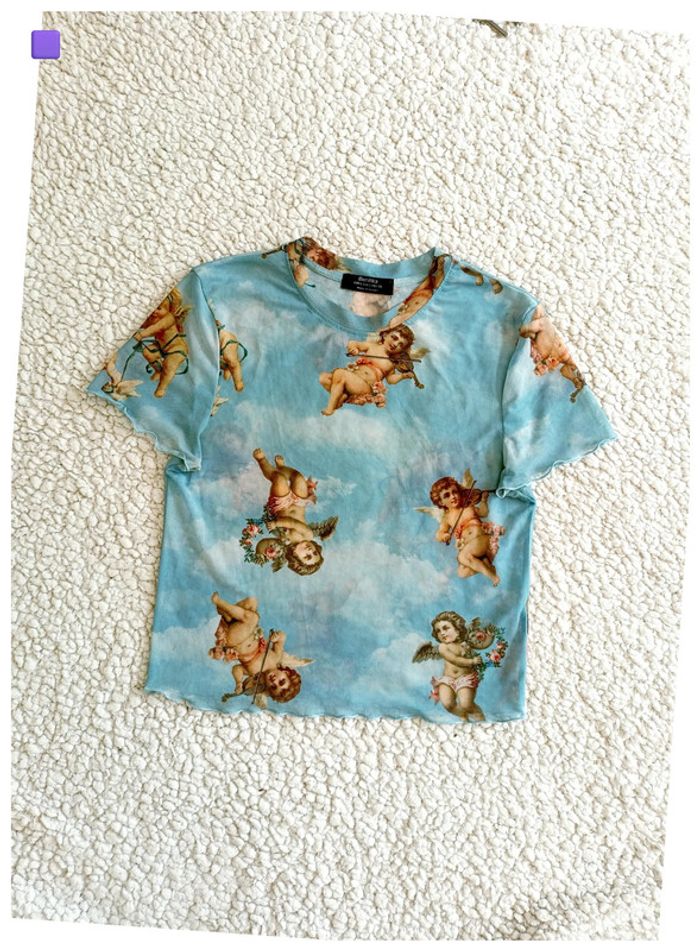 (j) Taille : S T-shirt près du corps en mesh fin, imprimé anges sur fond de ciel. Style Y2K affirmé. #bershka #vintage #anges #bleuciel #y2k #mesh #imprimé