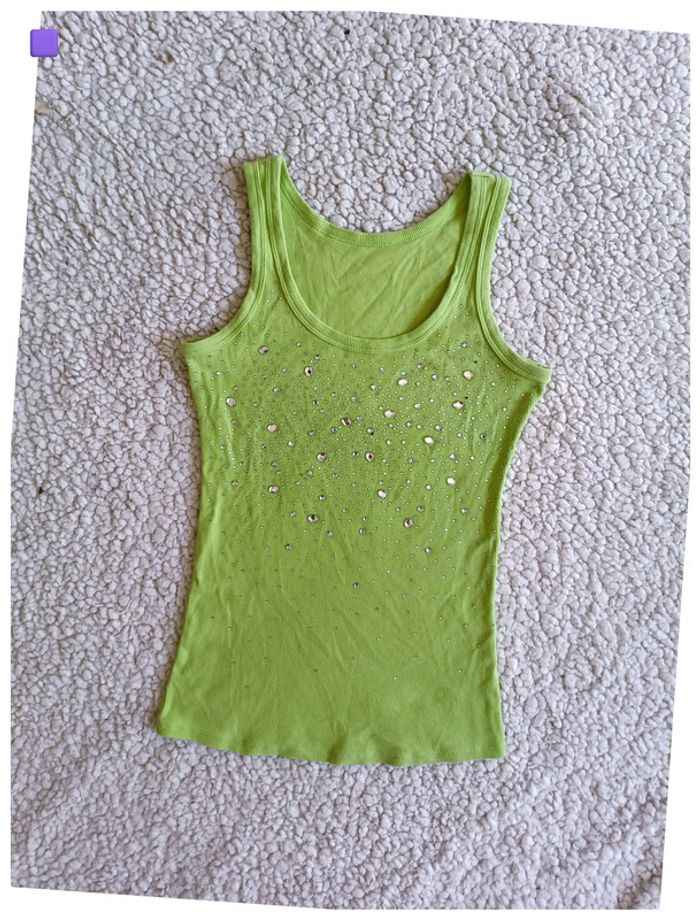 Débardeur vert fluo à strass paillettes brillant vintage old school – Taille S - photo numéro 1