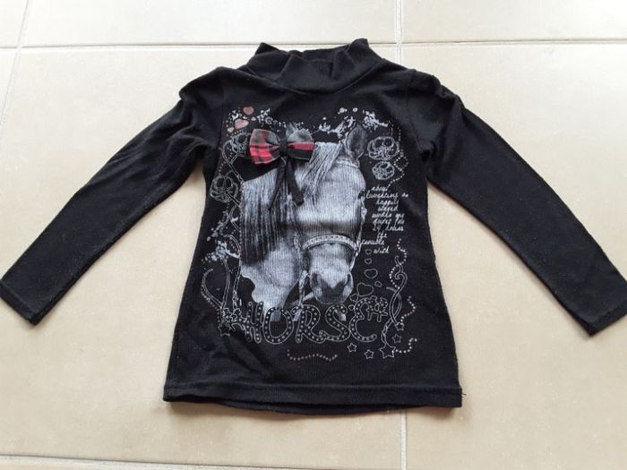 T-shirt ML col montant noir "cheval" fille 4 ans