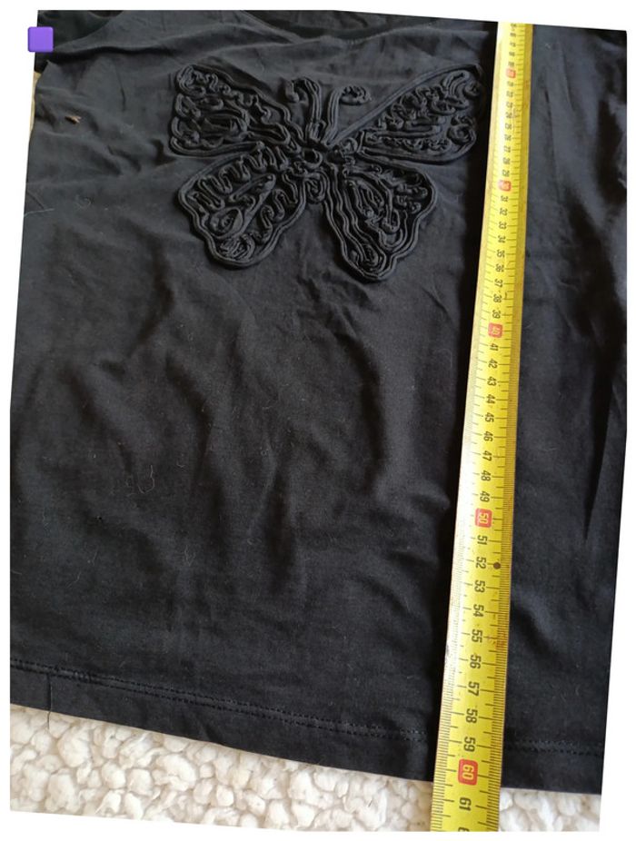 (M) Taille L mais je dirais S/M, extensible dans tous les cas. Haut noir manches courtes. Motif papillon en relief sur le devant, style original #noir #haut #original #manchescourtes #Kycréation