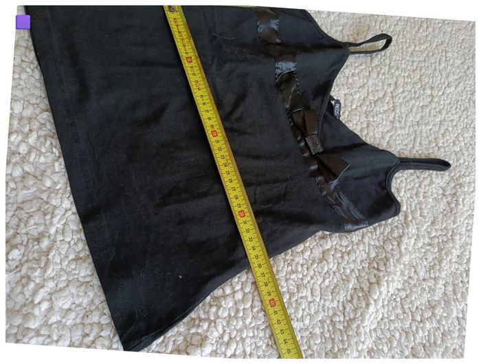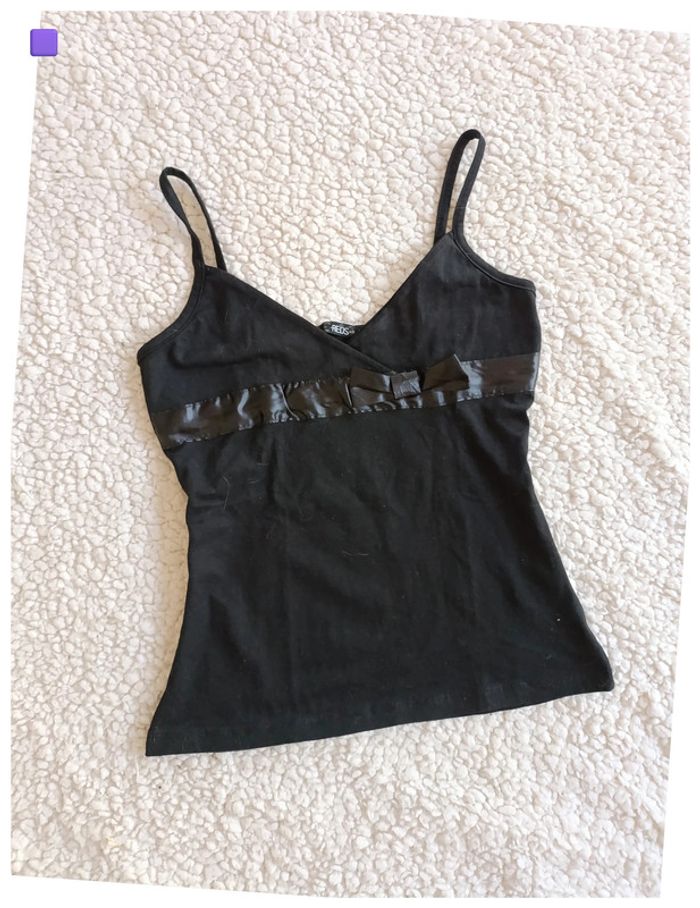 (K) Débardeur noir satiné avec petit nœud Taille S/M. Détail ruban satiné sous la poitrine avec petit nœud. Coupe ajustée, matière douce et fluide. #noir #satiné #débardeur #noeud #féminin #vinted