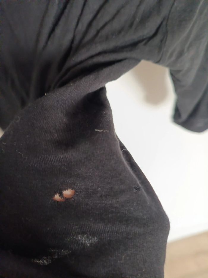 (E) T-shirt noir manches boutons Morgan – Taille non indiquée, peut convenir à du S/M Haut fluide manches trois-quarts boutonnées, encolure ronde. Quelques petits trous visibles (voir dernière photos). #vintage #noir #morgan #boutons #fluide