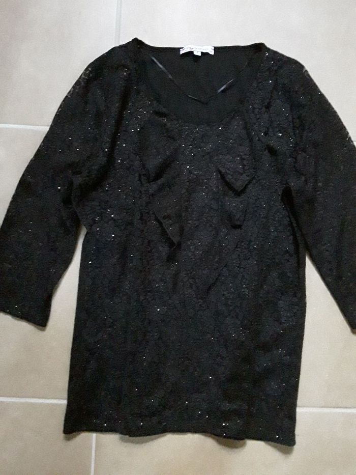 Tunique en dentelle noire doublée sur tout le torse (pas les manches). Donc transparente uniquement au niveau des bras. Comme neuve.