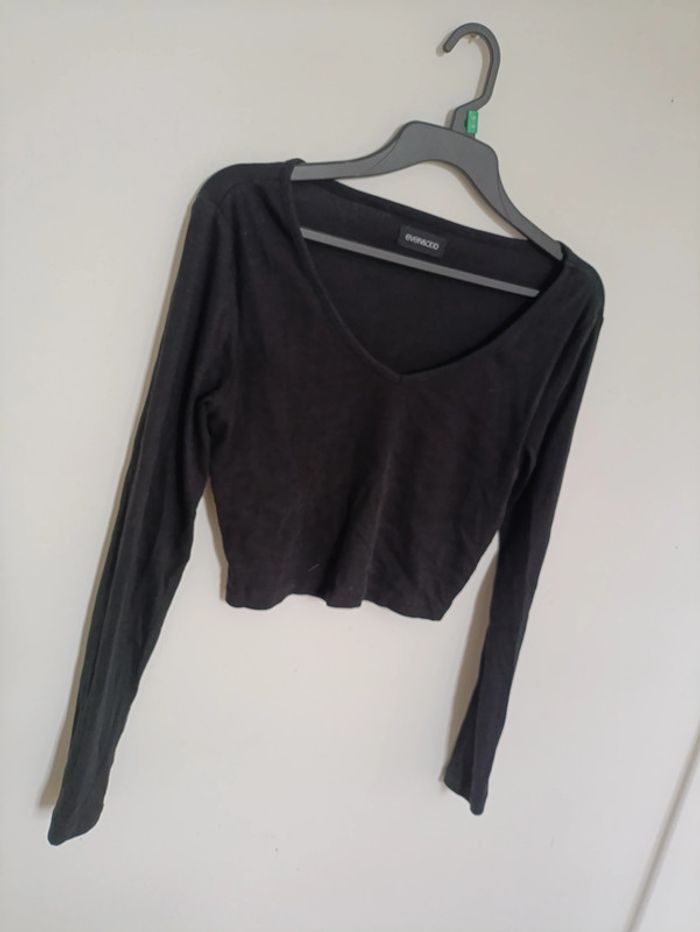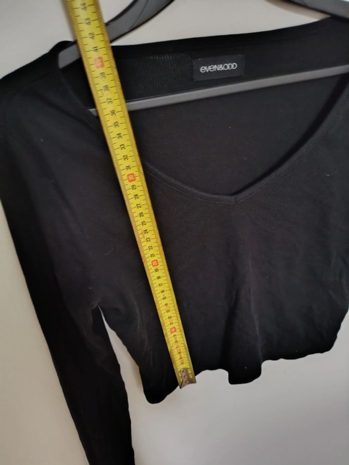 (D) Top noir côtelé à manches longues Even&Odd M Top noir à manches longues, matière côtelée extensible, coupe courte avec encolure en V. Basique à porter au quotidien. Marque Even&Odd, taille M mais convient S #vintage #evenandodd #noir #mancheslongues #topcourt #côtelé #m