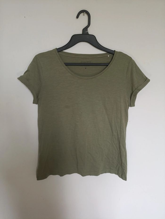 (F) T-shirt kaki en coton bio EDC Esprit – taille M T-shirt à col rond de couleur kaki, en coton biologique, léger et agréable à porter. Taille : M #vintage #kaki #cotonbio #edc #tshirt