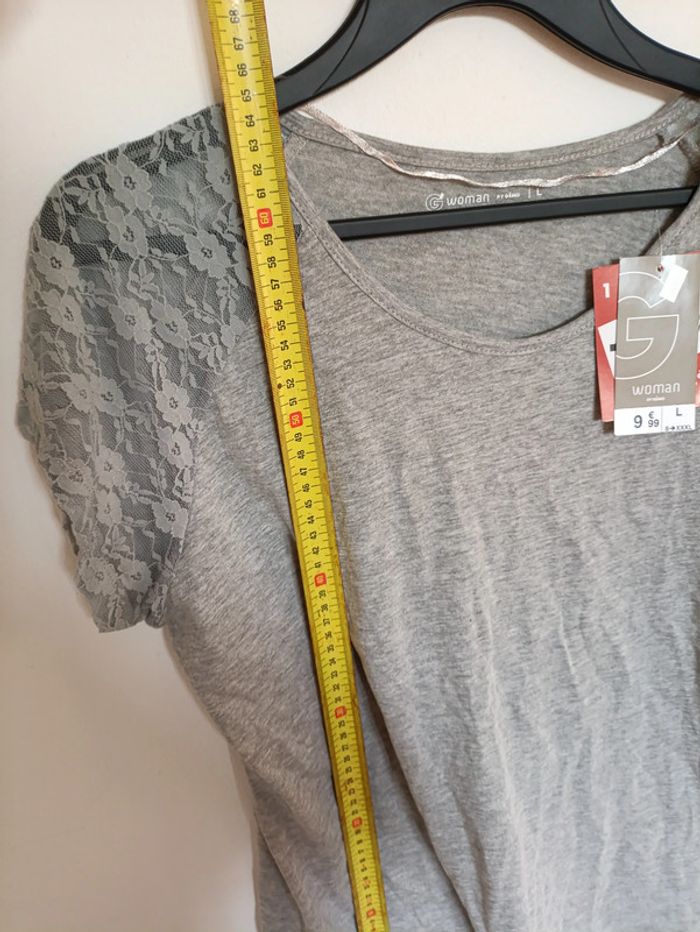 (E) T-shirt gris neuf gémo – Taille L mais convient plus petit aussi suivant effet désiré, S/M sans soucis T-shirt neuf avec étiquette, gris chiné avec manches en dentelle. Coupe droite simple. #gris #basique #dentelle #tshirt #neuf