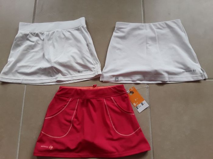 1 jupe-short ARTENGO NEUVE et étiquetée couleur orange et rouge. 8€ 1 jupe-short ARTENGO en très bon état blanche. 4€ 1 jupe-short TECNOPRO en très bon état blanche. 4€ Ou le lot de 3 à 15€. Les 3 sont en 6 ans. Me contacter.