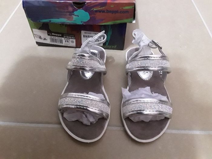 Sandales neuves pour petite fille en 26. Coloris argent (brillant) et blanc. Neuves et emballées, dans boîte d'origine. Marque BEPPI.
