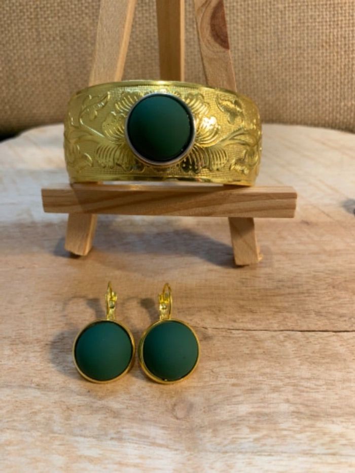 Parure de bijoux comprenant : Boucles d’oreilles dormeuses Bracelet avec bouton pression interchangeable Possibilité de vendre à l’unité. Les pressions peuvent être vendus séparément