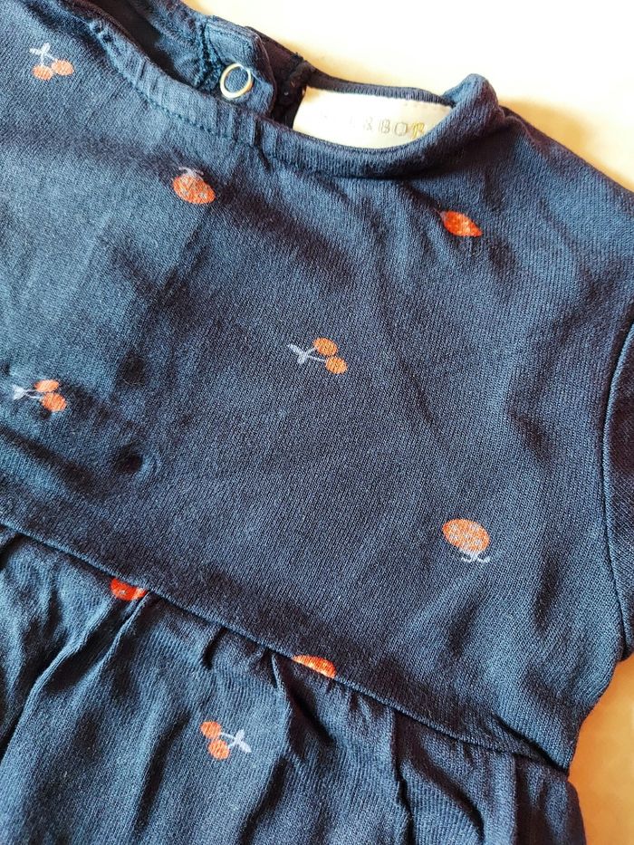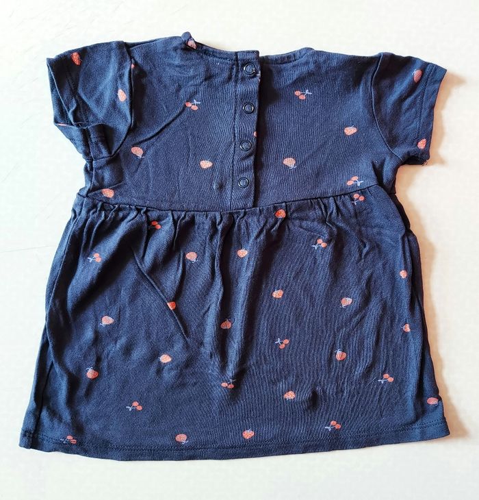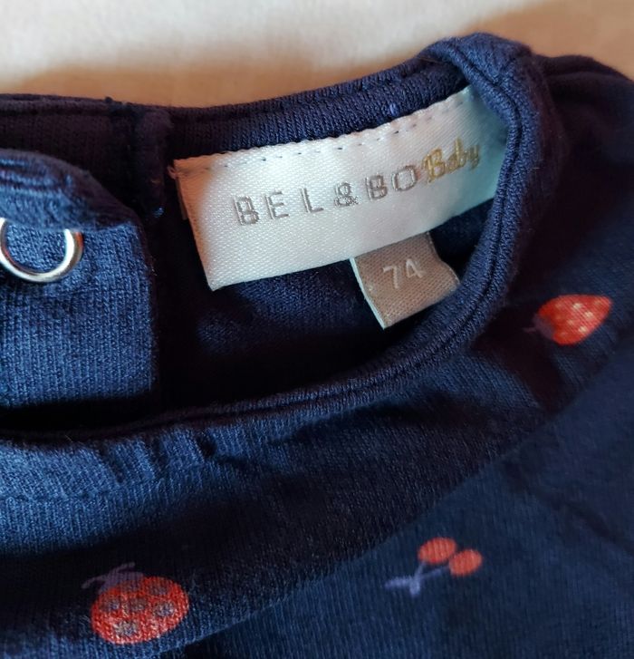 Je vends une tunique à courtes manches de couleur bleu foncé avec des motifs (cerises- coccinelles- fraises), elle possède des boutons à pressions dans le dos pour facilité le passage de la tête. Vient de chez Bel&Bo Baby, taille 74 (9 mois). Neuve, jamais mise.