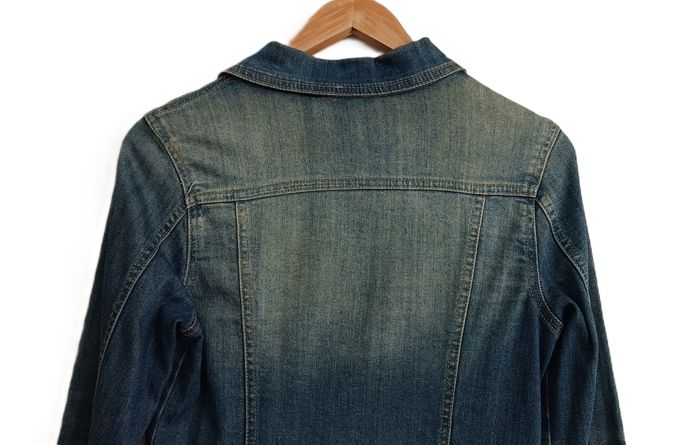 Veste en jean bleu effet délavé. FPC. Coton. Elasthanne. Taille S
