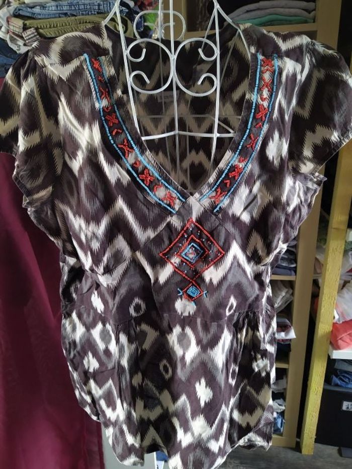 debardeur tunique originale marron et beige, souple / fluide avec motif et perles taille 48 de chez blancheporte dernière photo : trace interne au tissu #knine_femme_vetements #knine_femme_quarantehuit