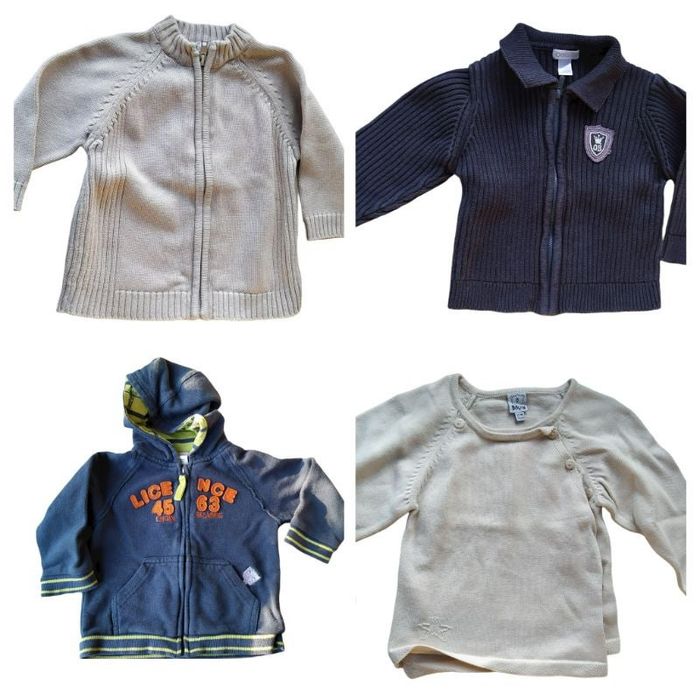lot 12 mois composé de : - 4 hauts manches longues (haut à capuche Tape à l'Oeil / chemise en jean Kiabi / Chemise anthracite Kimbaloo / chemise bleu Obaibi) : 15 euros - 4 pull/gilets (1 gilet beige Kimbaloo / 1 gilet marine Obaidi / 1 gilet à capuche Orchestra / 1 pull beige Bruin) - 4 jeans (1 noir délavéPikOuik / 1 bleu Obaidi / 1 jean type Cargo Kimbaloo / 1 doublé Obaidi) : 12 euros - 1 pantalon toile noir Orchestra : 3 euros #knine_enfant_12mois