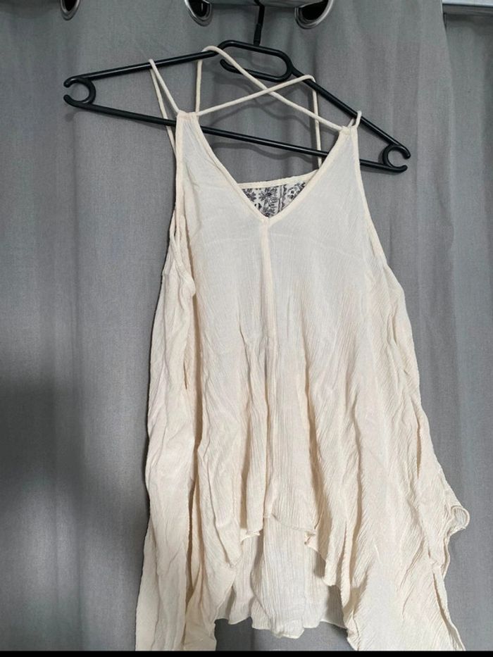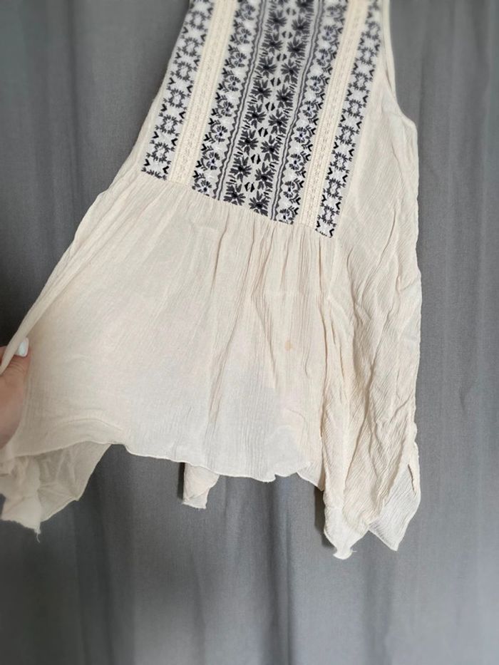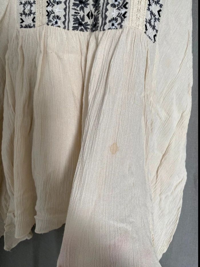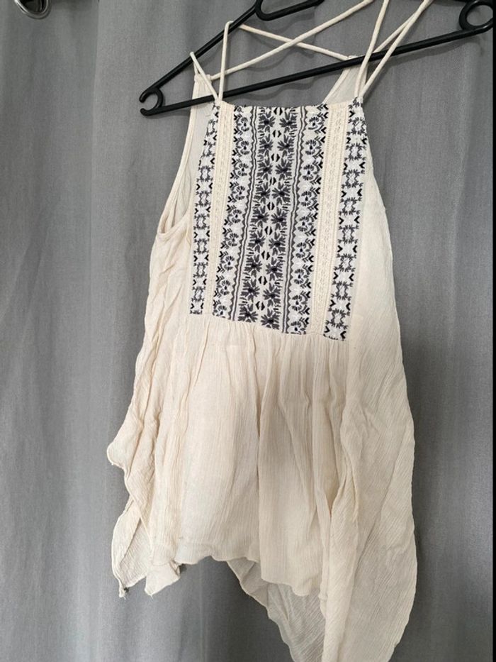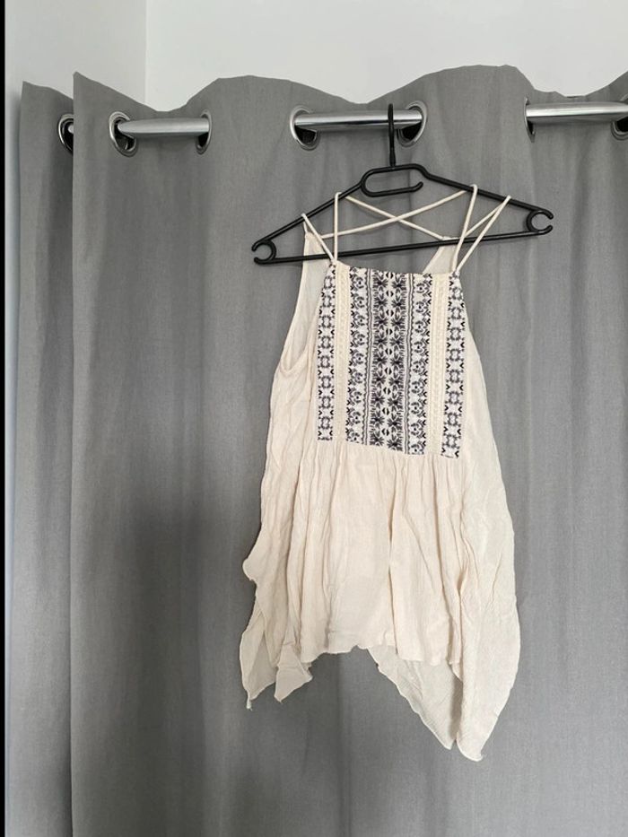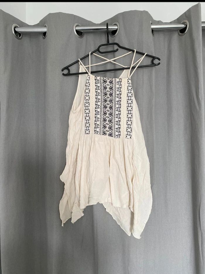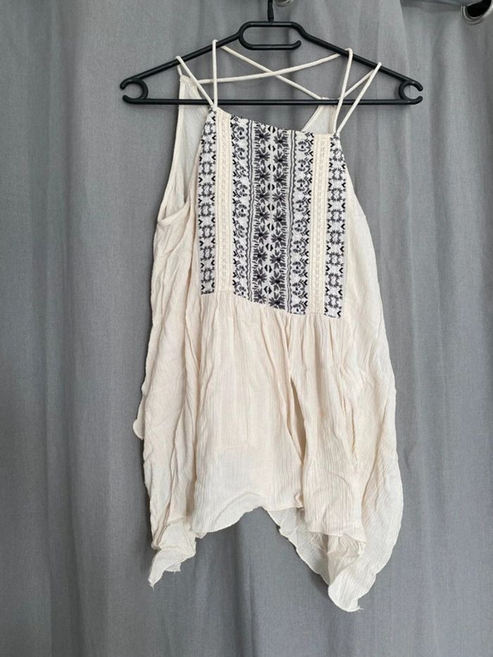 Blouse Blouse beige avec motifs broderie, gris, noir et blanc Bon état mais ⚠️ tâches sur le devant (voir photos) Bretelles qui ont légèrement jaunies Taille XS Blouse fluide, plus courte à l’arrière et plus longue sur le devant Marque Abercrombie 12€