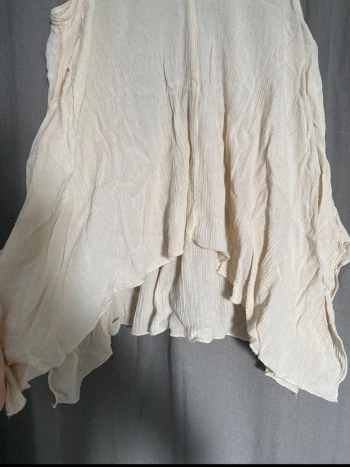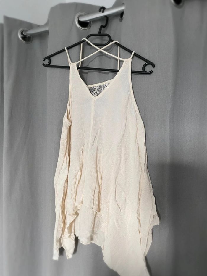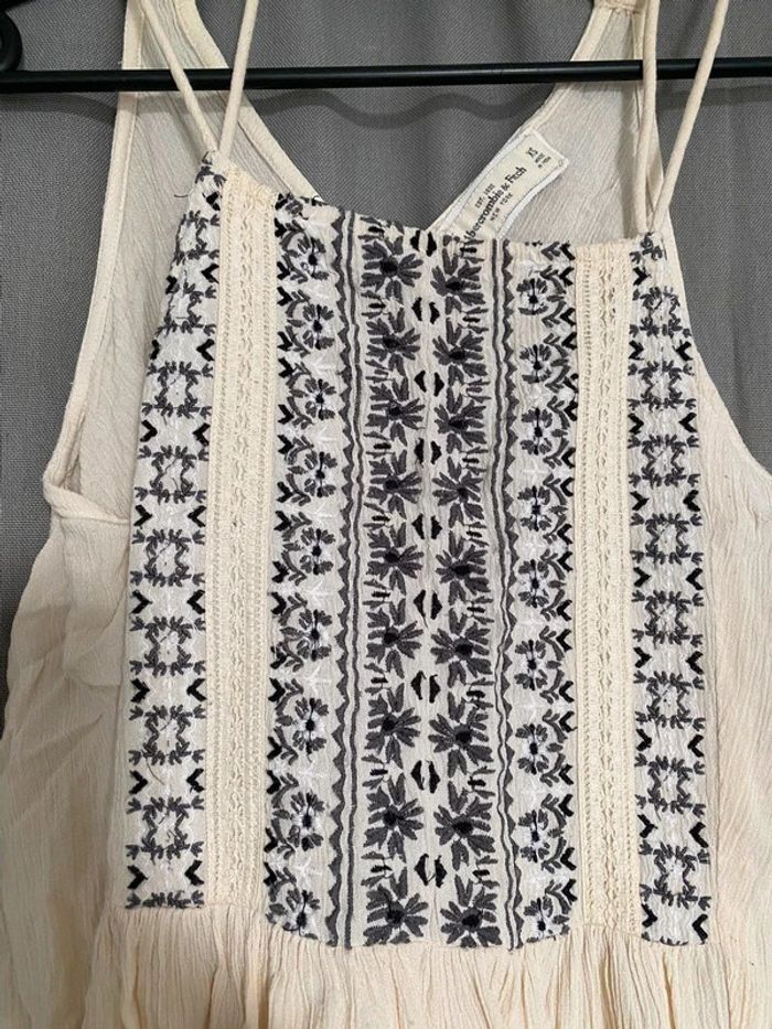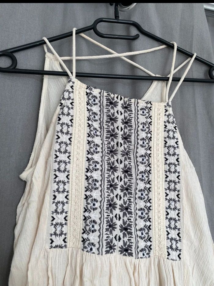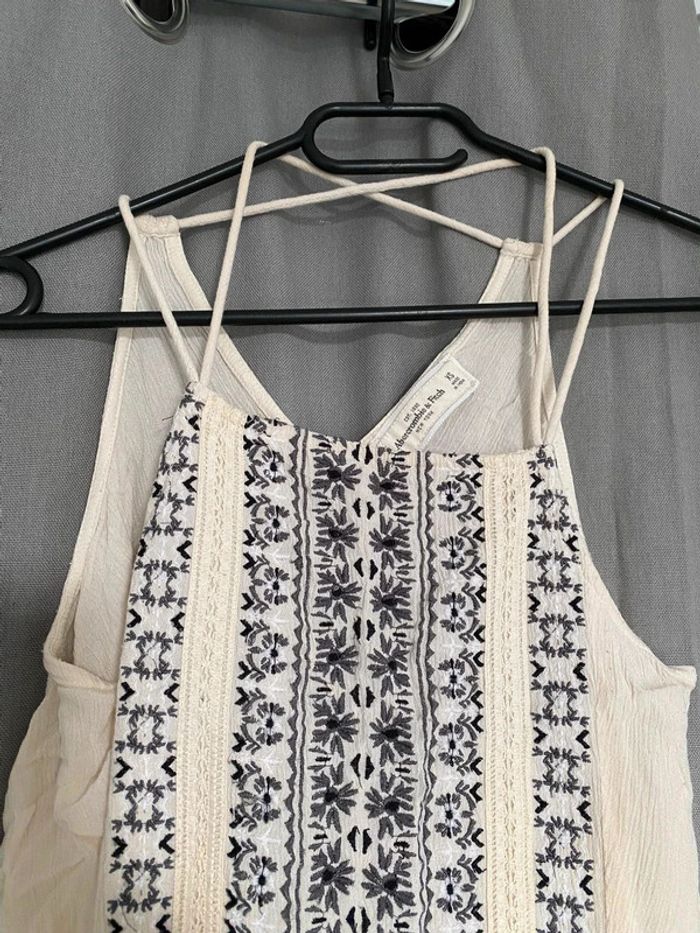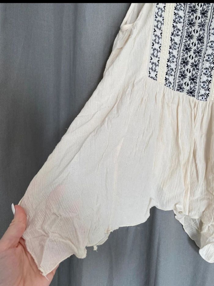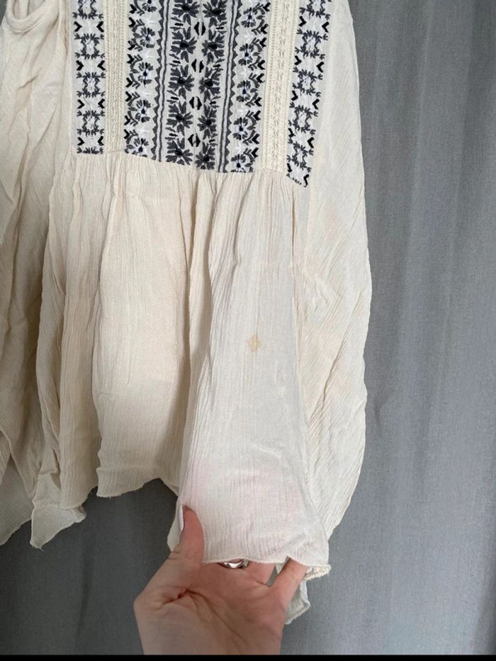 Blouse Blouse beige avec motifs broderie, gris, noir et blanc Bon état mais ⚠️ tâches sur le devant (voir photos) Bretelles qui ont légèrement jaunies Taille XS Blouse fluide, plus courte à l’arrière et plus longue sur le devant Marque Abercrombie 12€