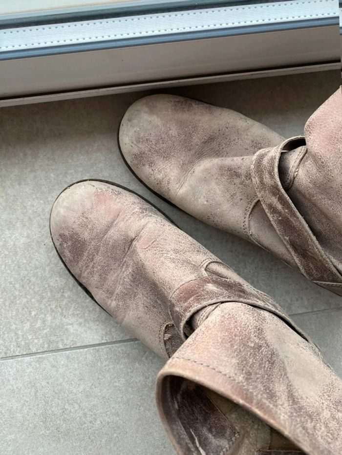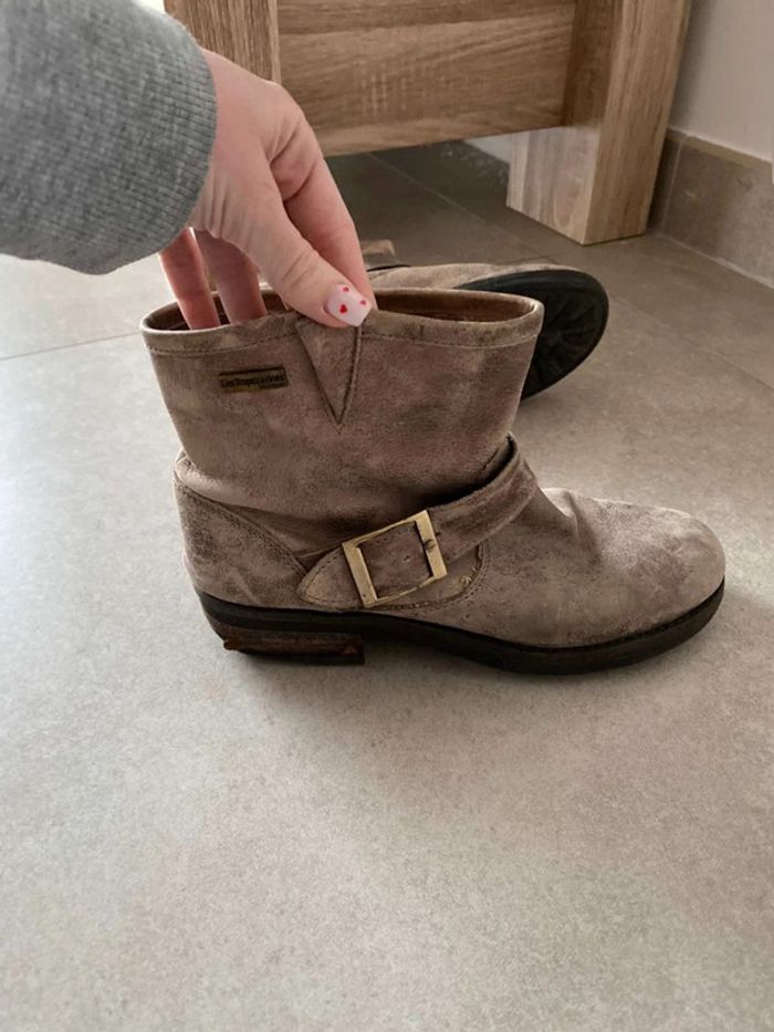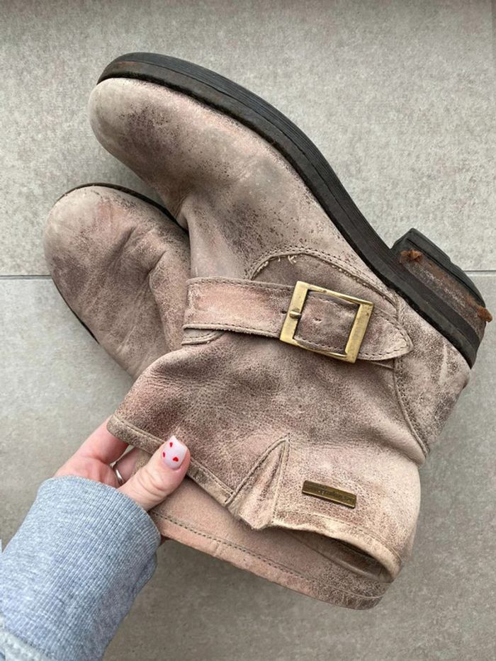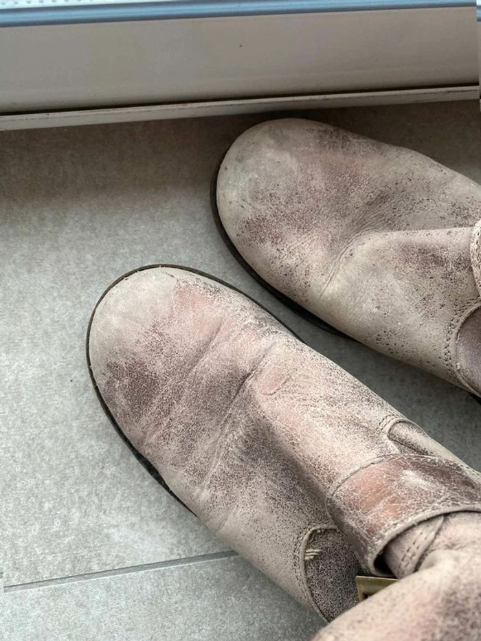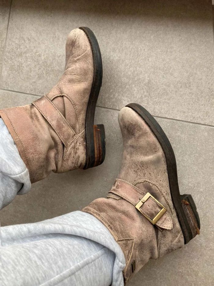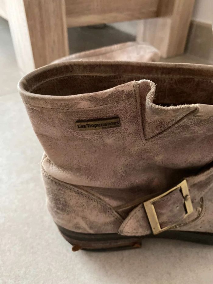 Bottines doré Effet vintage/ vieilli Bottines dorés avec une grosse boucle Bon état, talons un peu abîmé ⚠️ voir photos (car porté assez souvent) Bottines confortable (semelle confortable) Marque Les Tropéziennes Taille 38