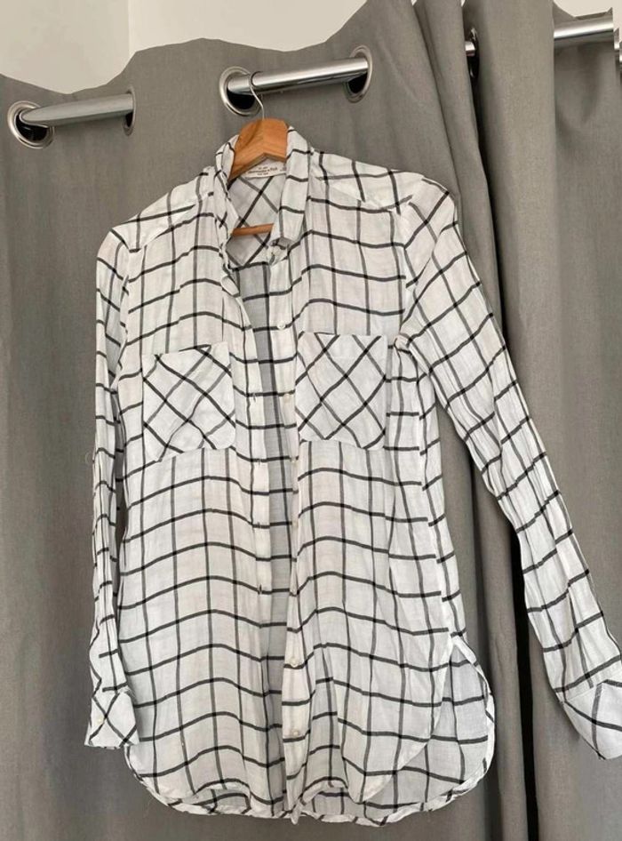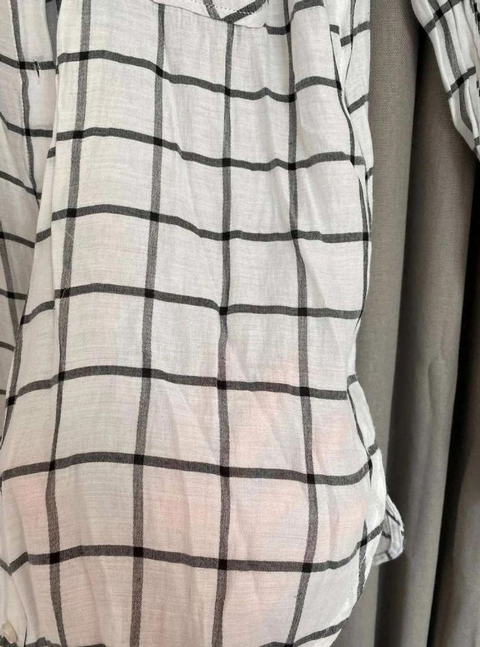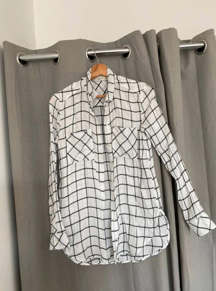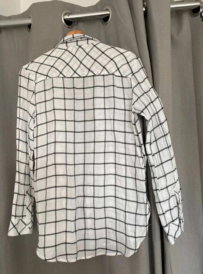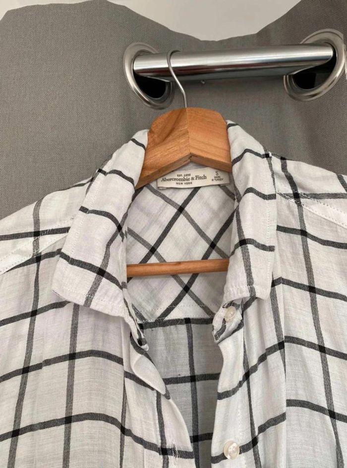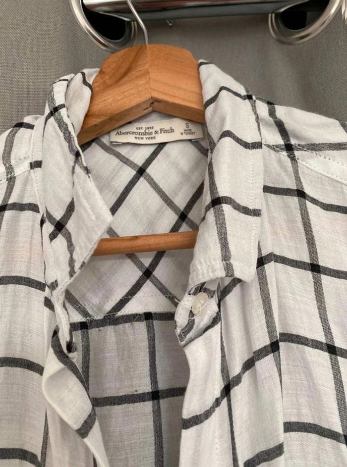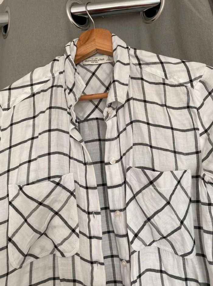 Chemise à carreaux Couleurs blanc gris et noir Deux poches sur le devant au niveau de la poitrine Matière plutôt fine Très bon état Sauf à l’arrière au niveau de l’aisselle droit ça se decout.. voir photos Marque Abercrombie Acheté 65€