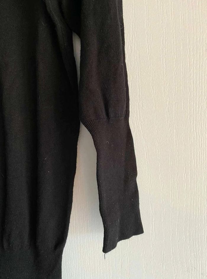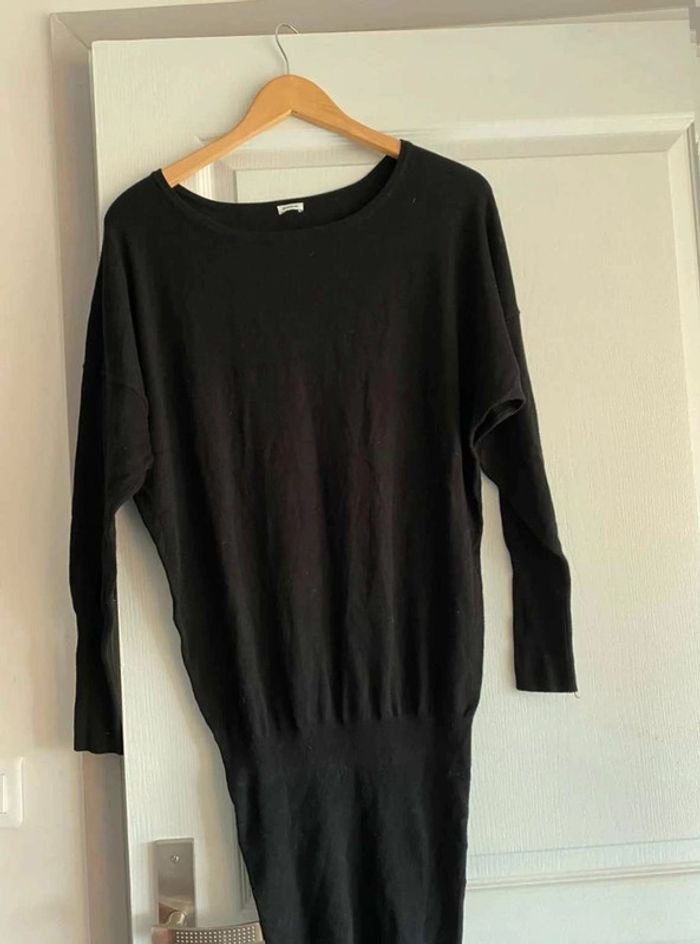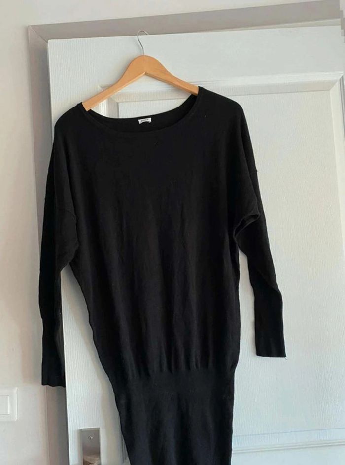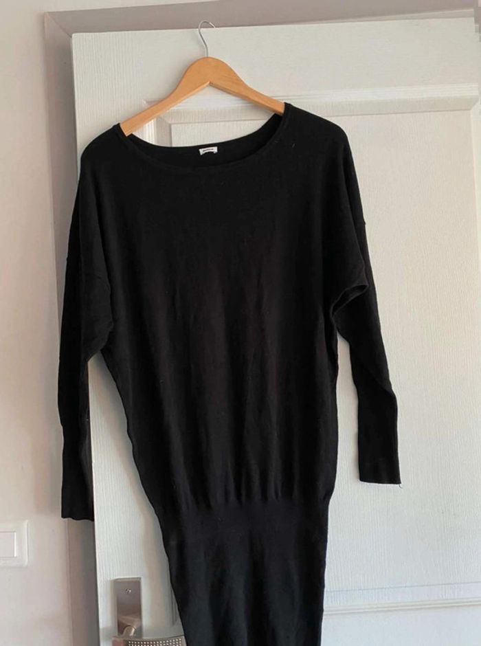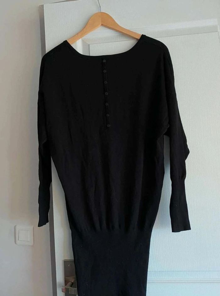Robe noire Simple sur le devant- Serre en bas Bouton à l’arrière - Serre en bas Se porte large en haut et serre en bas Très bon état (mais matière qui attrape un peu les peluches et poussière) Me demander plus de photos si intéressée ☺️