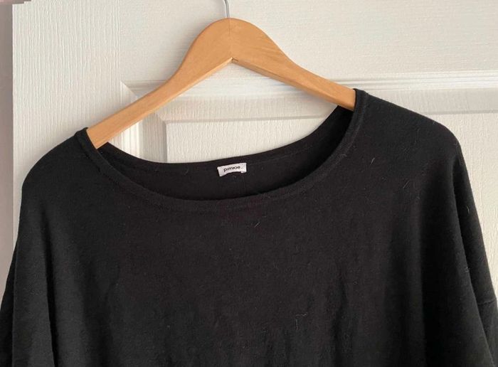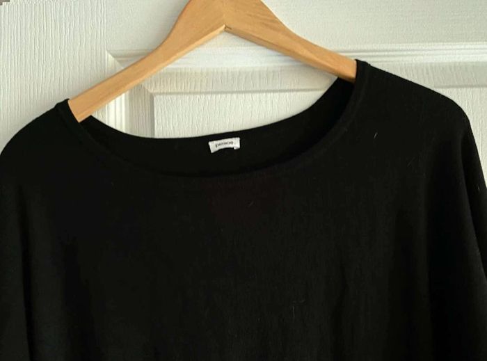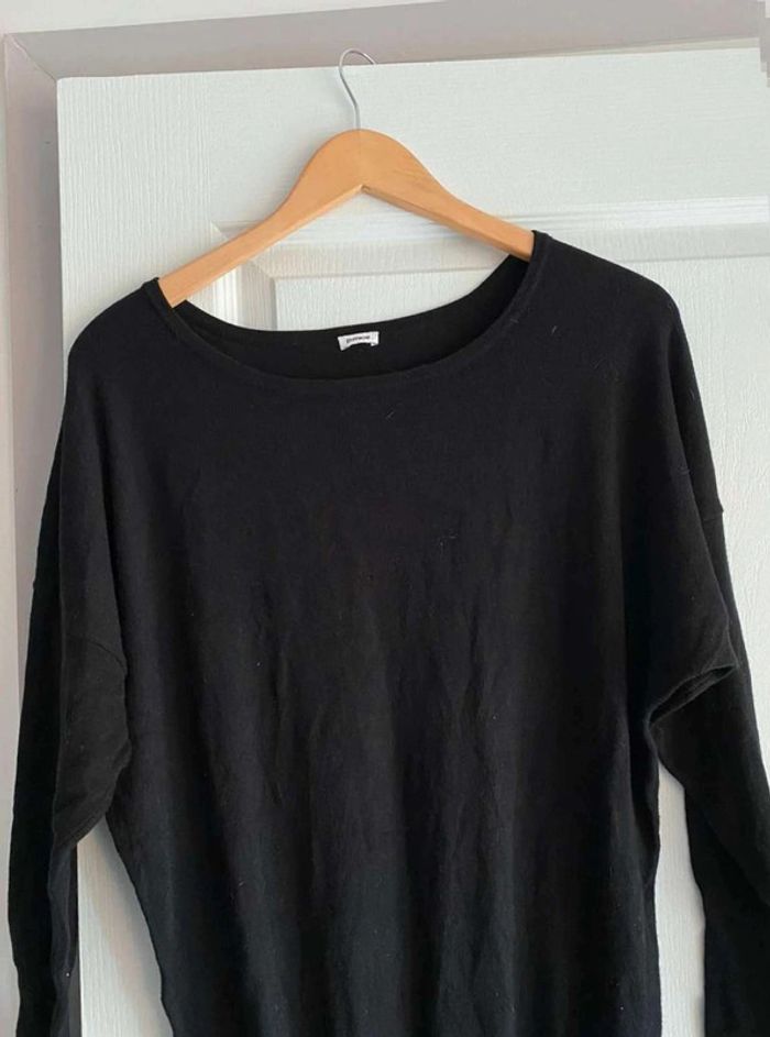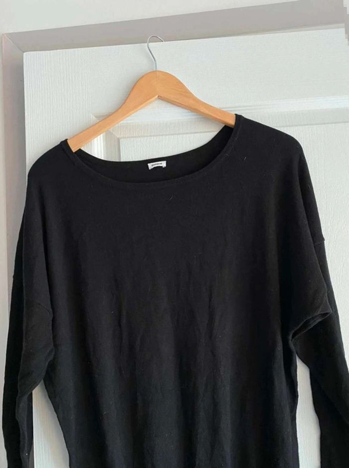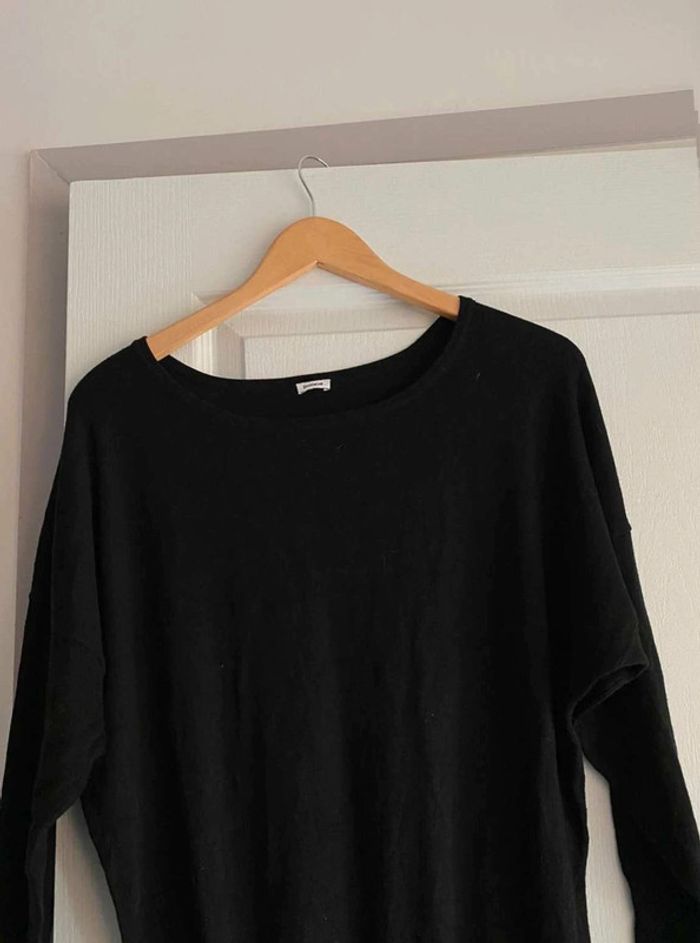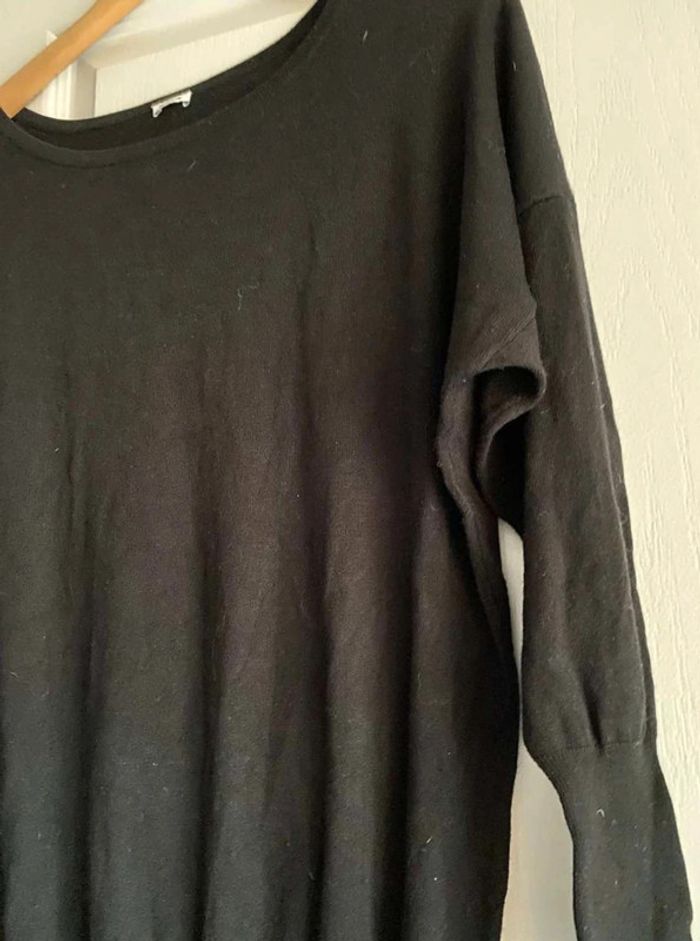 Robe noire Simple sur le devant- Serre en bas Bouton à l’arrière - Serre en bas Se porte large en haut et serre en bas Très bon état (mais matière qui attrape un peu les peluches et poussière) Me demander plus de photos si intéressée ☺️