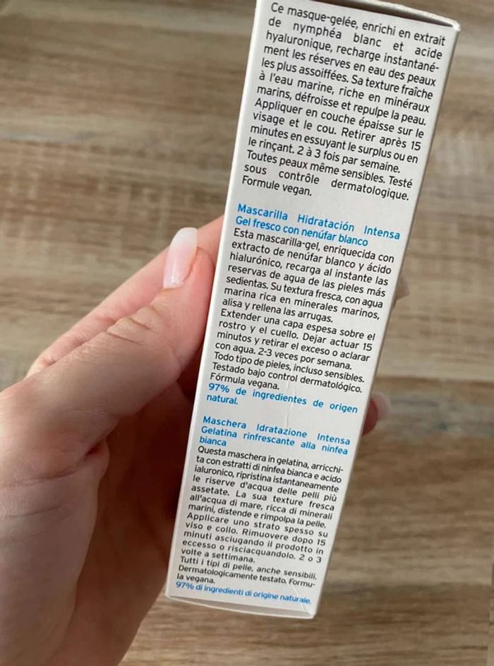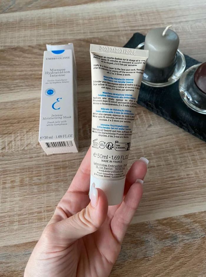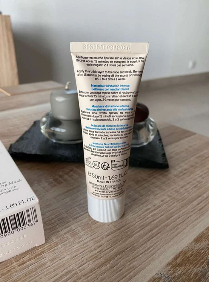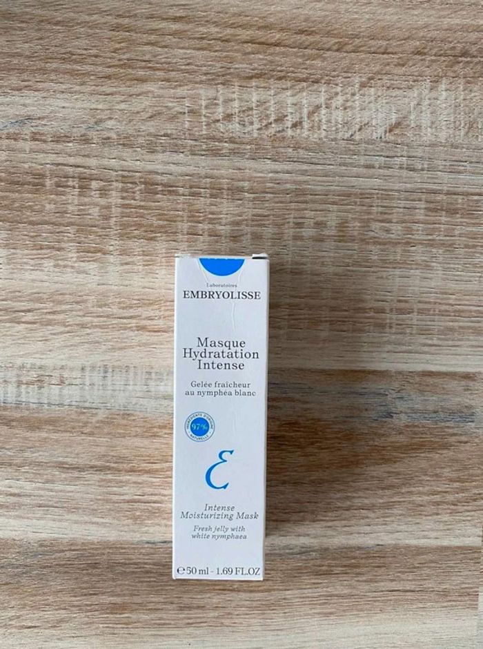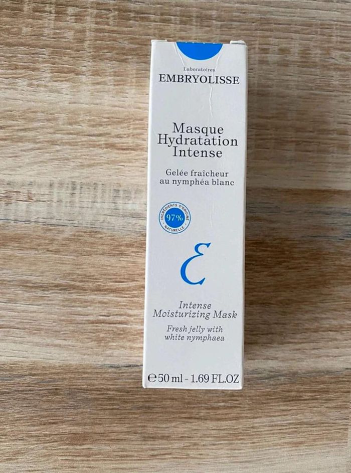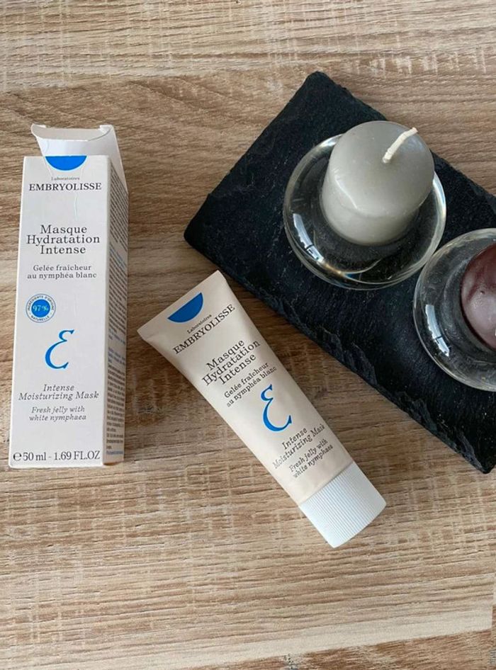 Masque hydratation Masque hydrations intense Crème fraîcheur au nymphéa blanc Produit neuf Format 50ml, format vente 50 ml vendu 17,25€ Marque Embryolisse 15€ Ce masque-gelée, enrichi en extrait de nymphéa blanc et acide hyaluronique, recharge instantanément les réserves en eau des peaux les plus assoiffées.