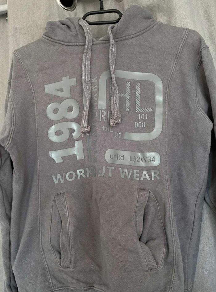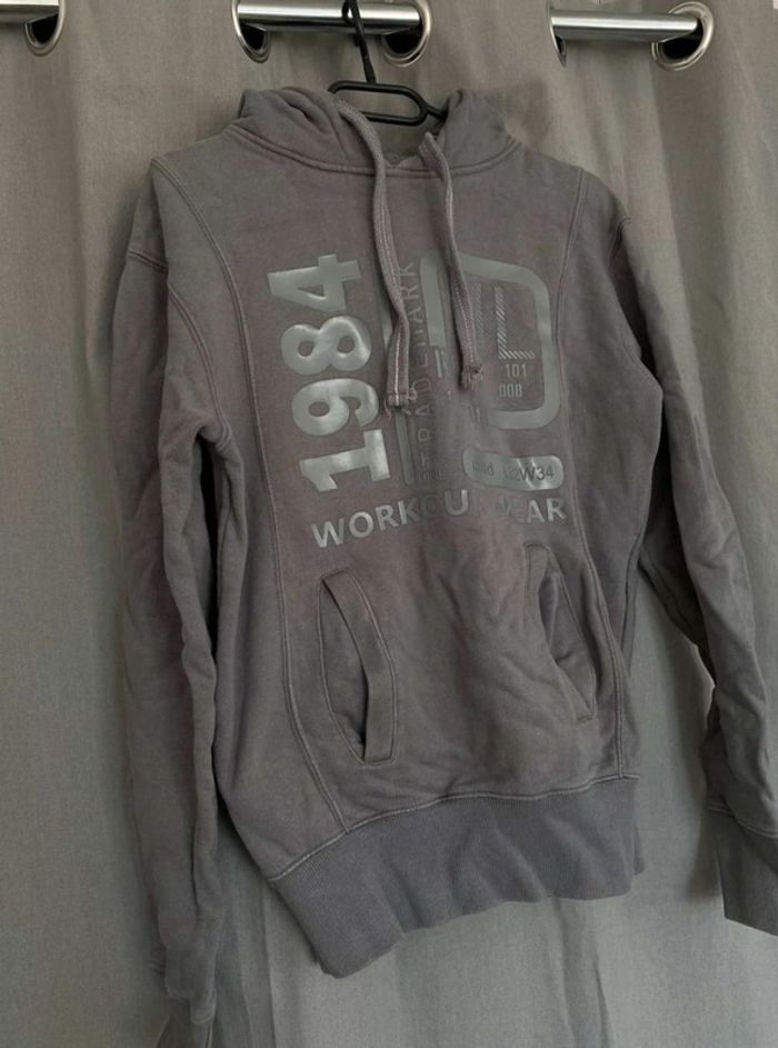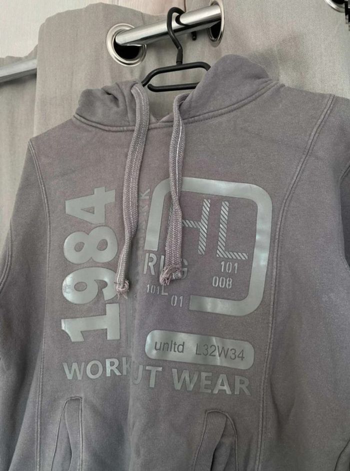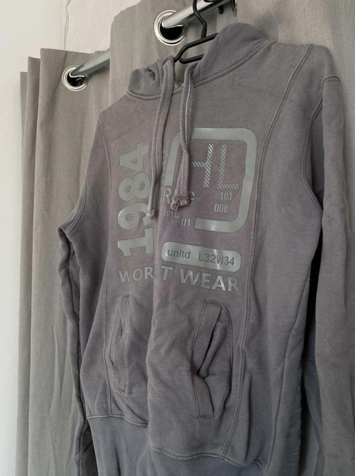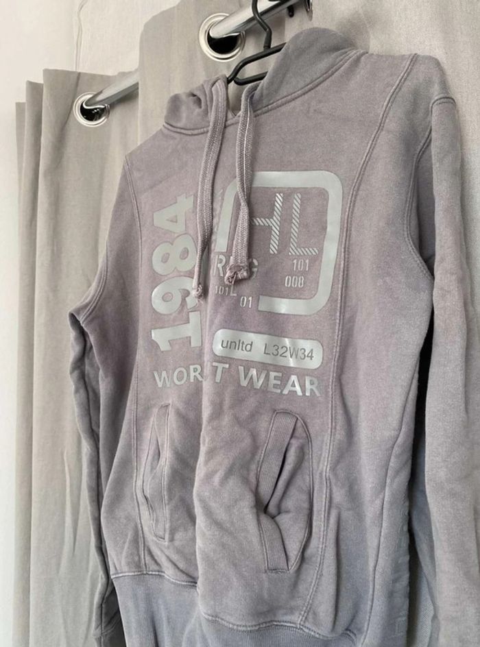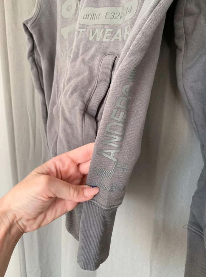 Sweat Gros sweat gris Modèle homme mais peut faire mixte Très bon état ⚠️ une légère tache sur la manche à droite (voir photos) Sweat avec capuche Porte quelques fois Écriture et logo sur le devant + poche sur le devant Écriture sur le côté de la manche gauche + sur le côté droit du sweat+ sur la capuche H. Landers Taille S 14€