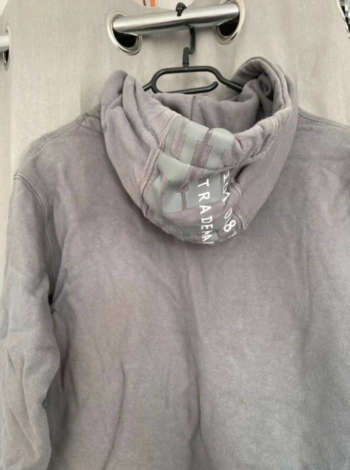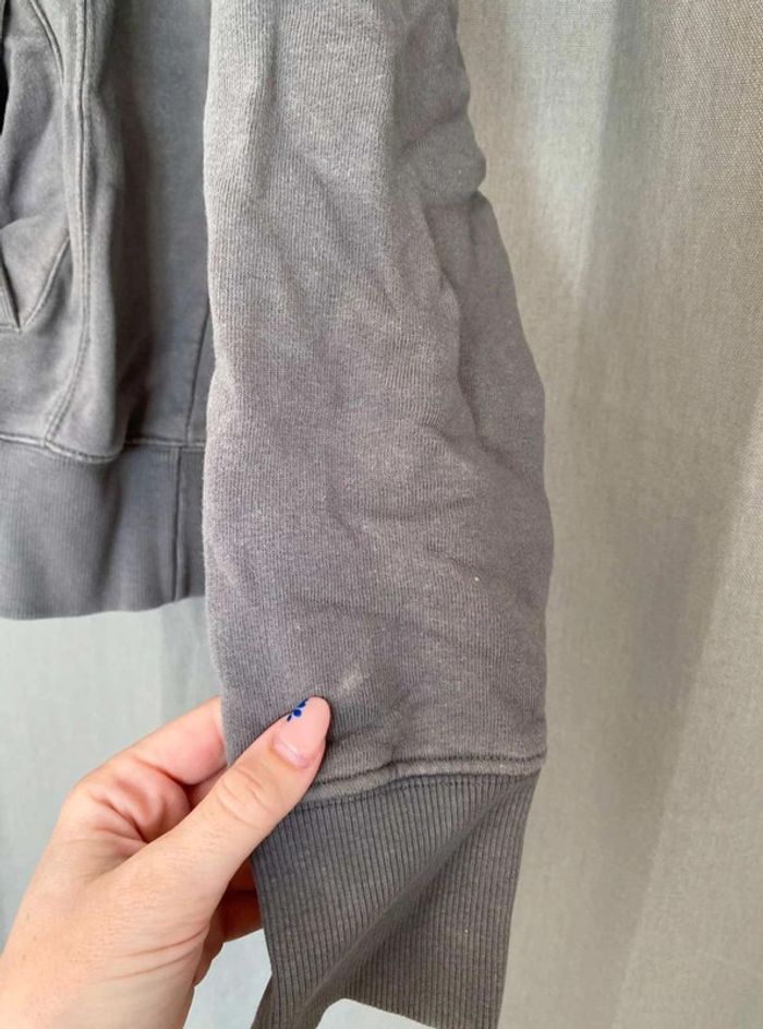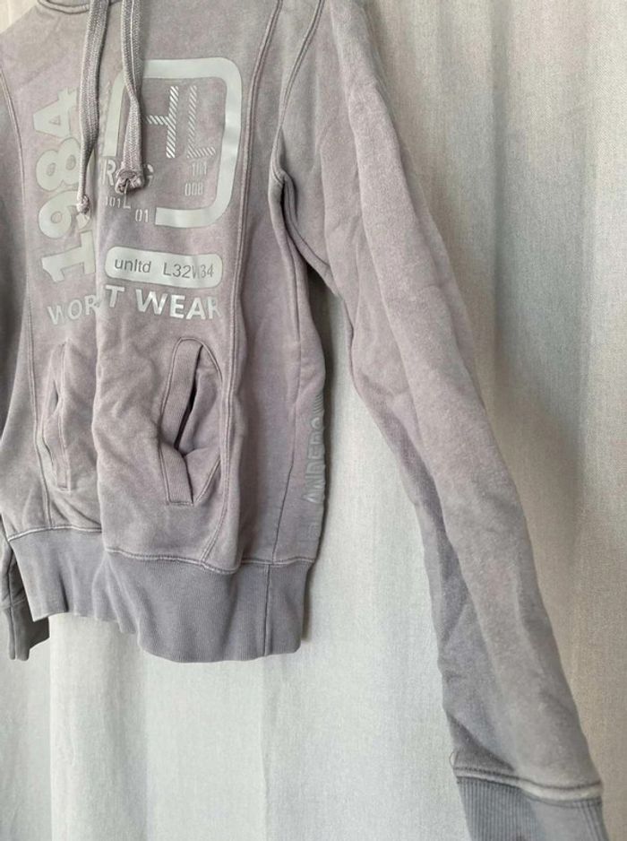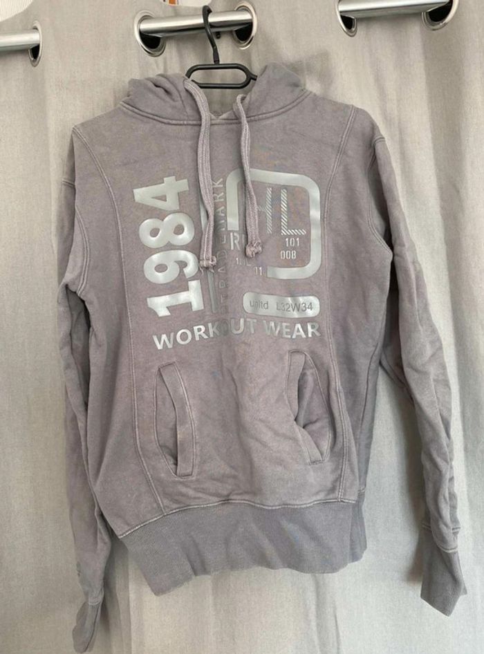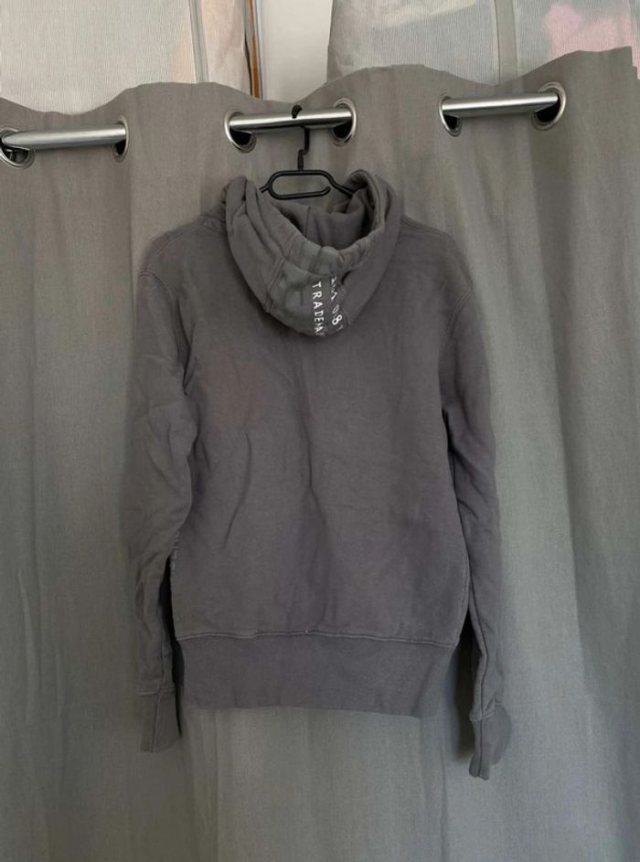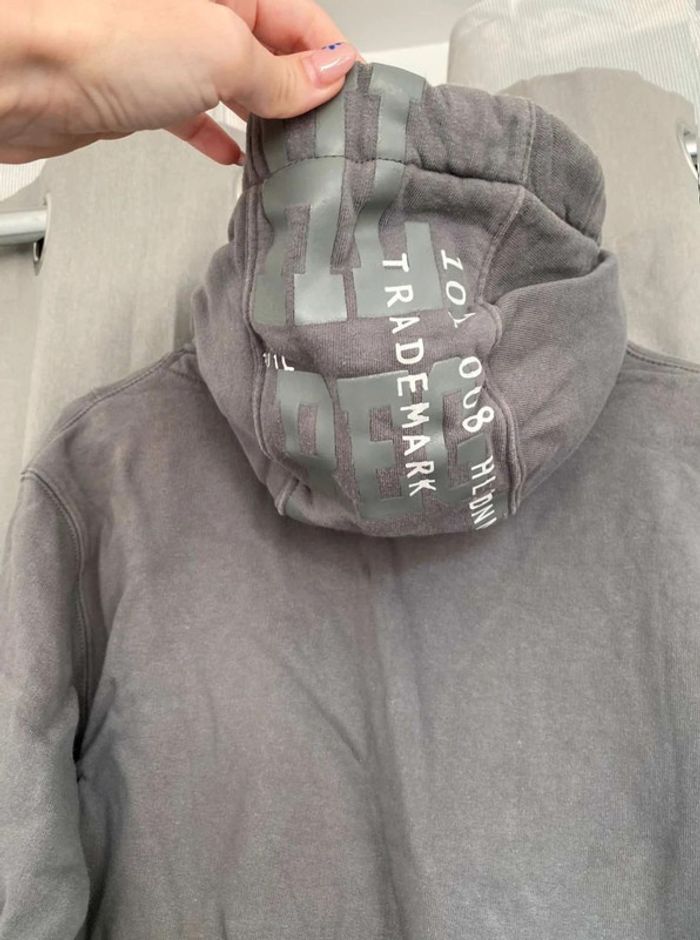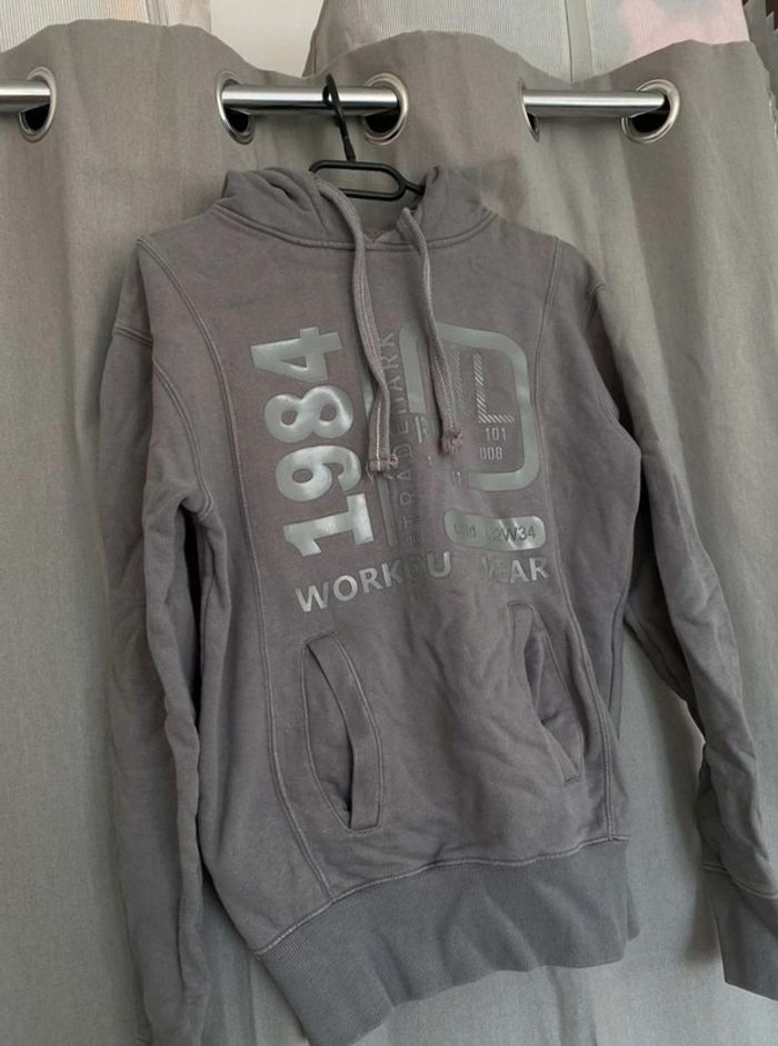 Sweat Gros sweat gris Modèle homme mais peut faire mixte Très bon état ⚠️ une légère tache sur la manche à droite (voir photos) Sweat avec capuche Porte quelques fois Écriture et logo sur le devant + poche sur le devant Écriture sur le côté de la manche gauche + sur le côté droit du sweat+ sur la capuche H. Landers Taille S 14€