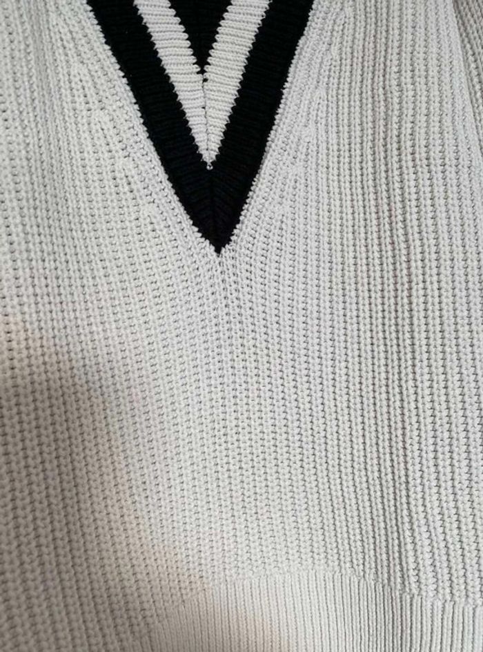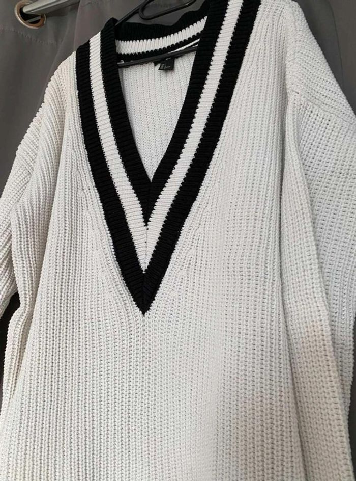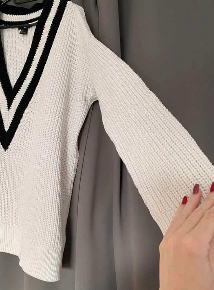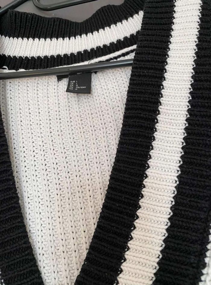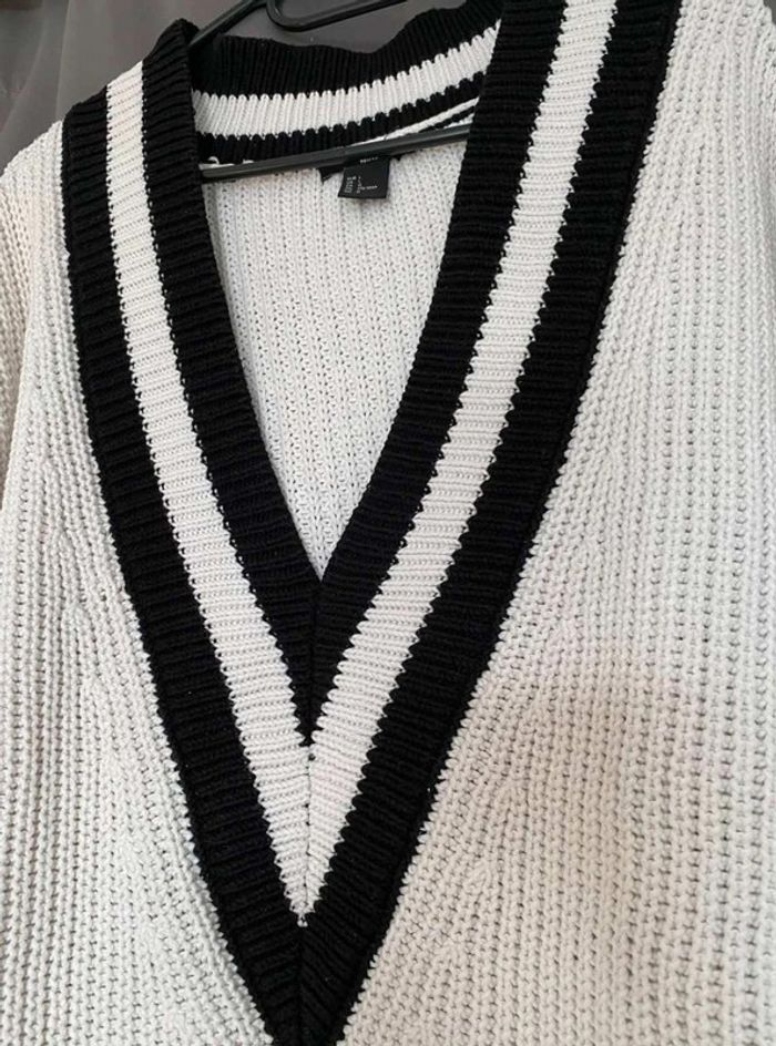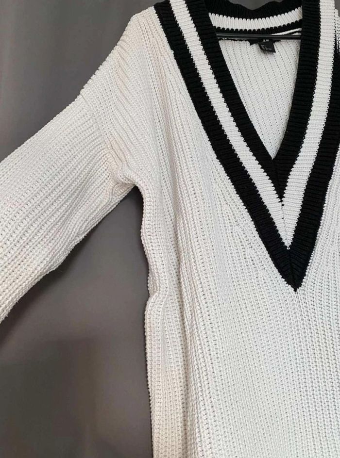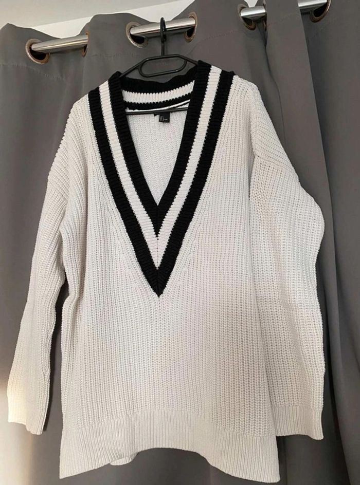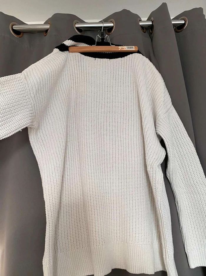 Gros pull beige, crème avec gros col V Blanc & noir (rayé sur le col) Très bon état Marque HM Taille L