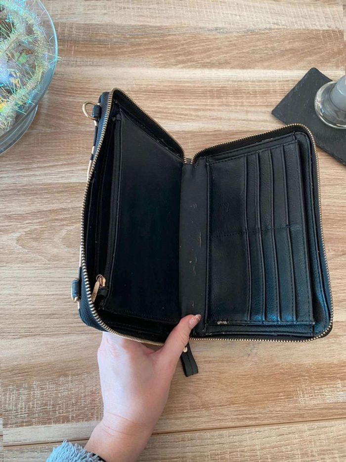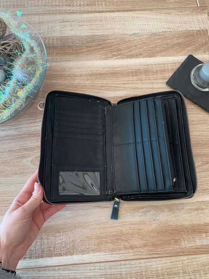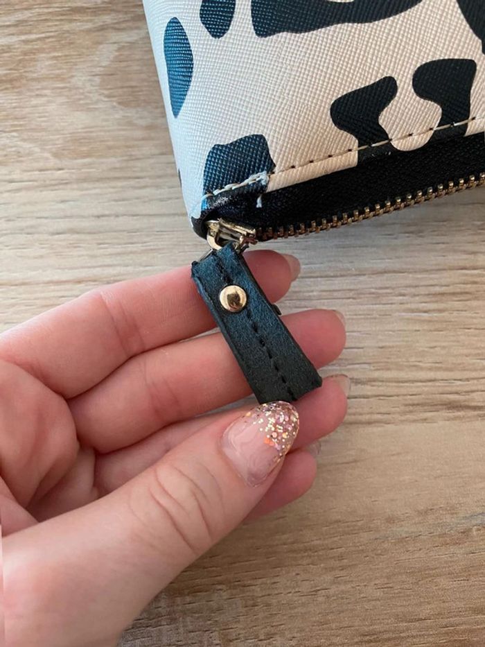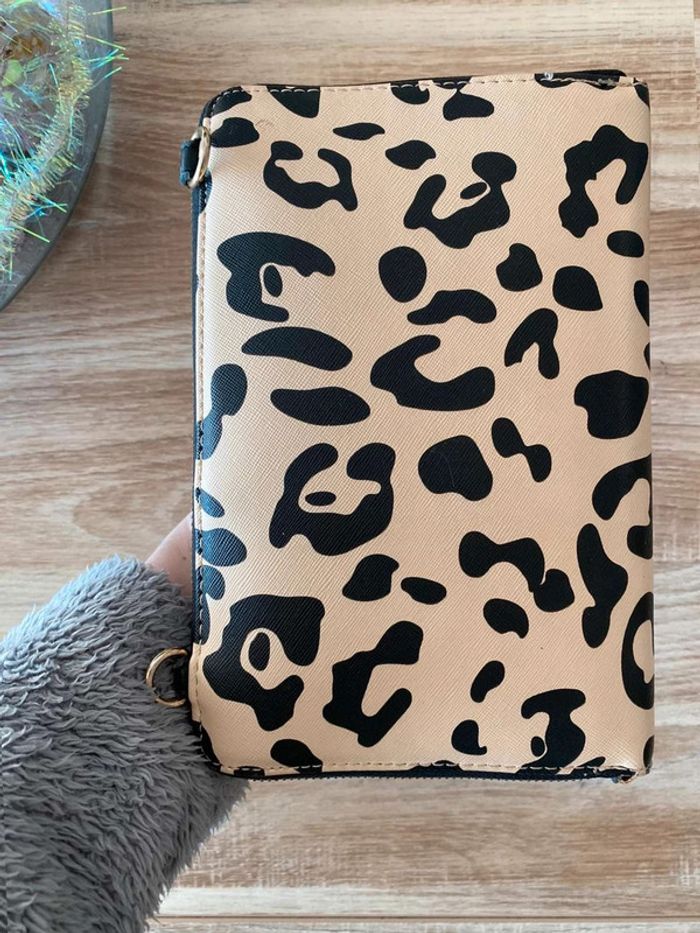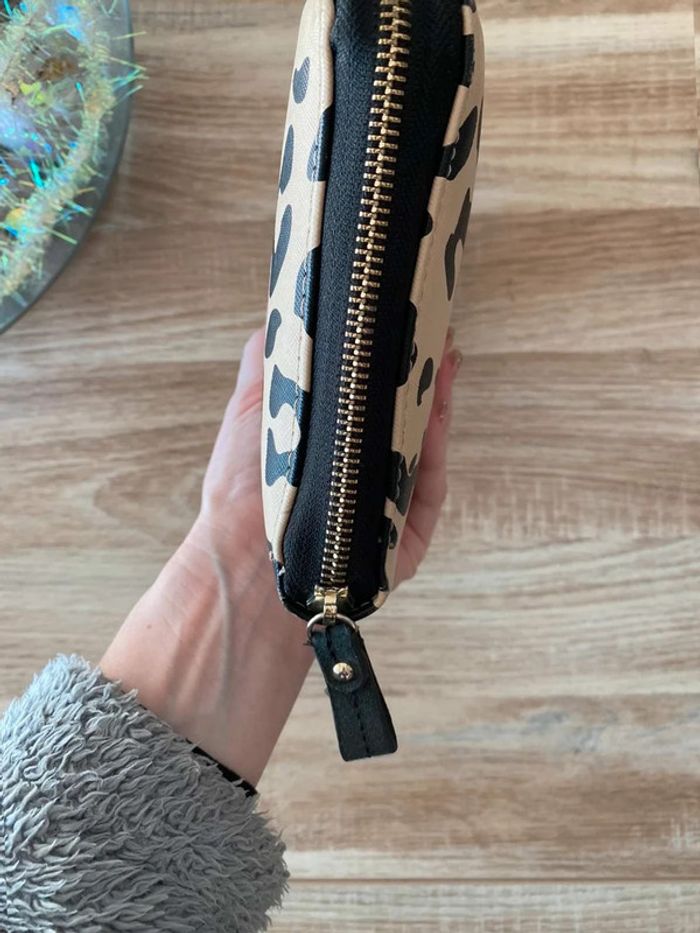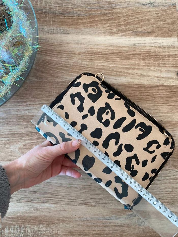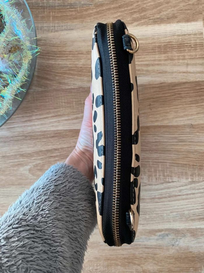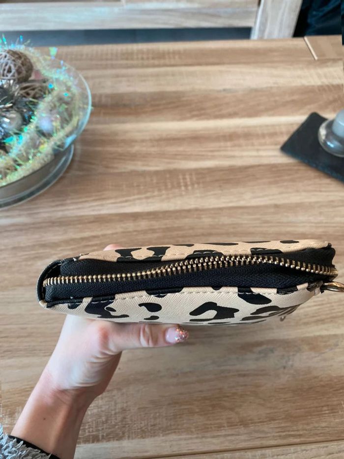 Pochette léopard Pochette multiusage Bon état Très bon état extérieur/ intérieur cuir un peu abîmé (voir photos) De très nombreux rangements pour cartes + une pochette à zip au milieu (voir photos) Léopard beige & noir Fermeture éclair dorée 2 trous sont disponibles pour le porter en bandoulière mais j’ai perdu la anse 😢 Marque Parfoi