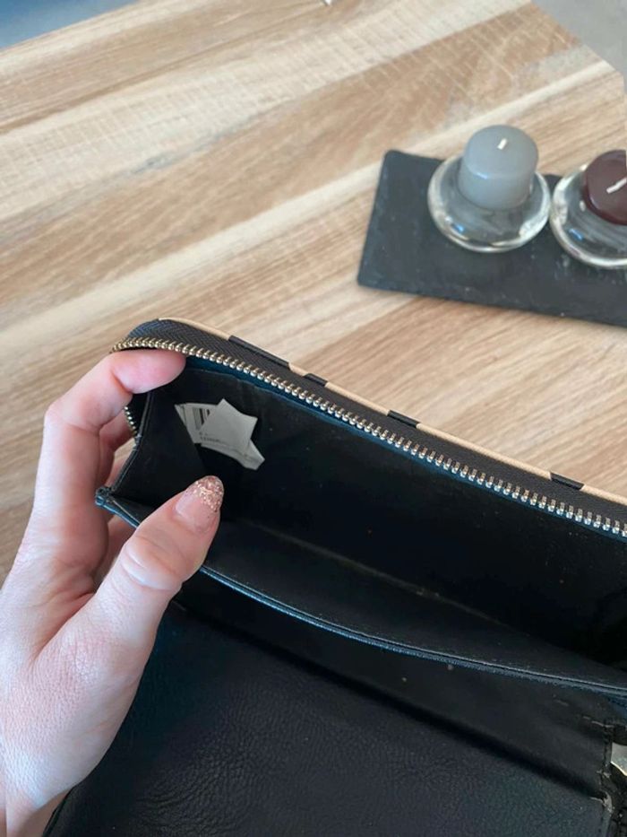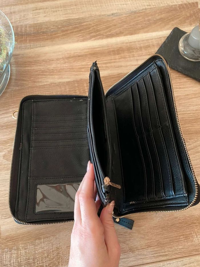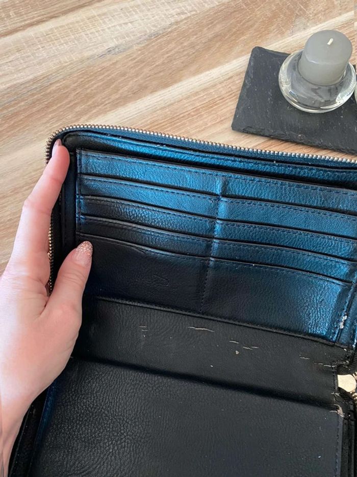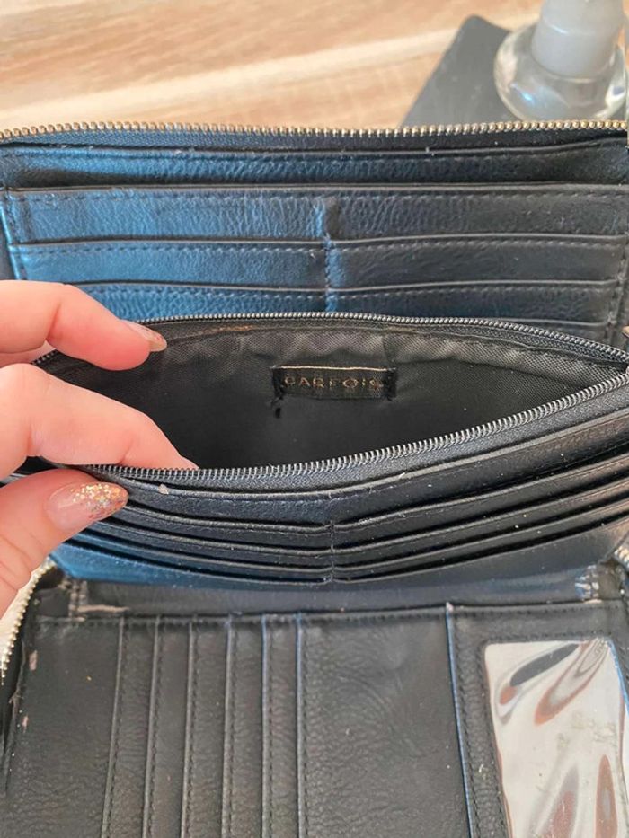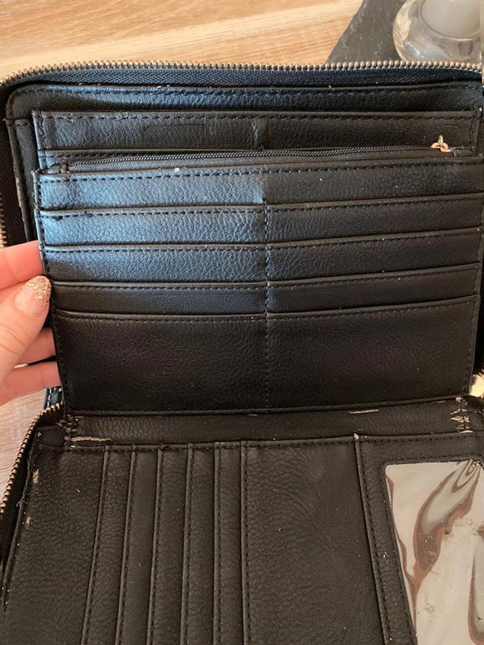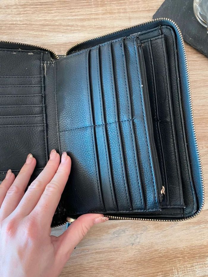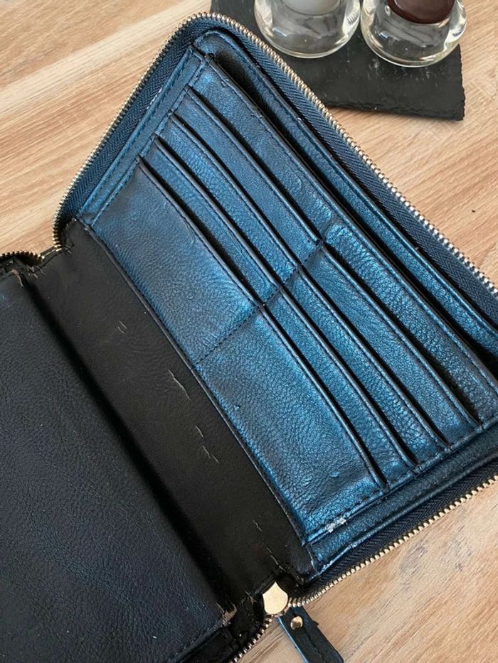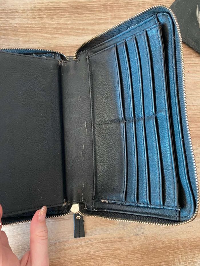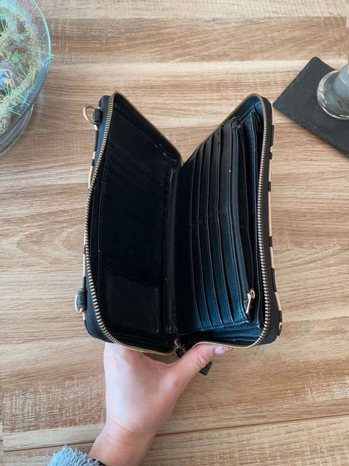 Pochette léopard Pochette multiusage Bon état Très bon état extérieur/ intérieur cuir un peu abîmé (voir photos) De très nombreux rangements pour cartes + une pochette à zip au milieu (voir photos) Léopard beige & noir Fermeture éclair dorée 2 trous sont disponibles pour le porter en bandoulière mais j’ai perdu la anse 😢 Marque Parfoi