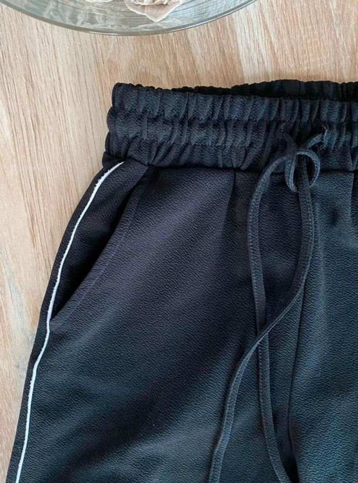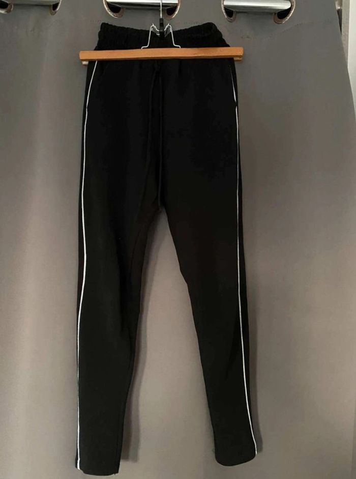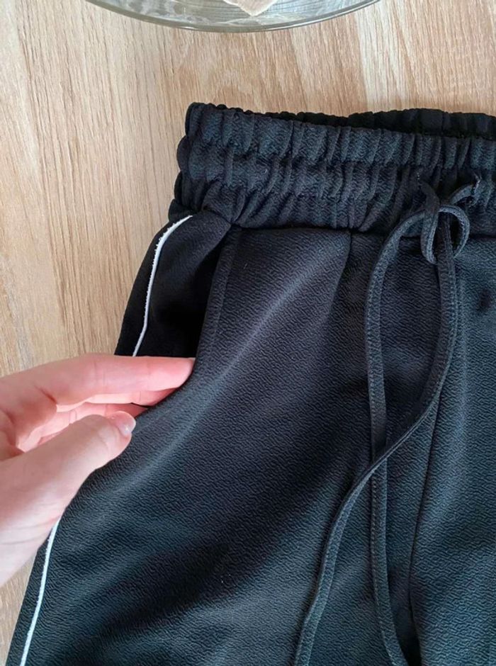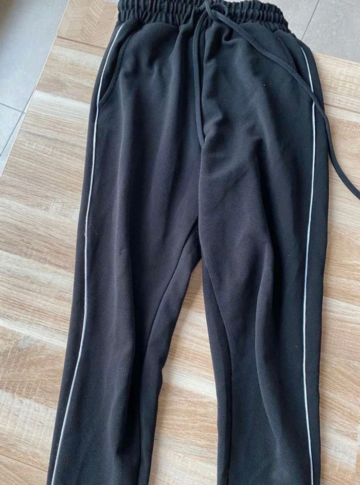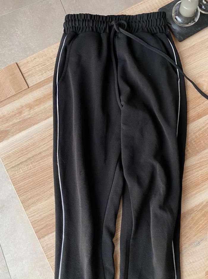Pantalon Pantalon plutôt large / noir et bandes fines blanches sur les côtés 2 poches devant et 2 fausses poches derrière Se noue et se resserre à la taille/ élastique à la taille Matière plutôt légère et fluide Très bon état Taille XS Marque Jennyfer 15€