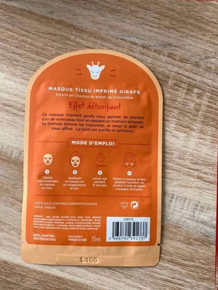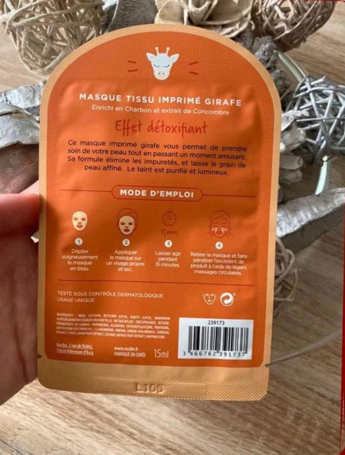 Masque visage Nocibe Produit neuf NOCIBÉ MY PRETTY ZOO Masque visage en tissu girafe - détox Bénéfice produit Format pratique. Effet repulpant et rafraîchissant. Joli design.