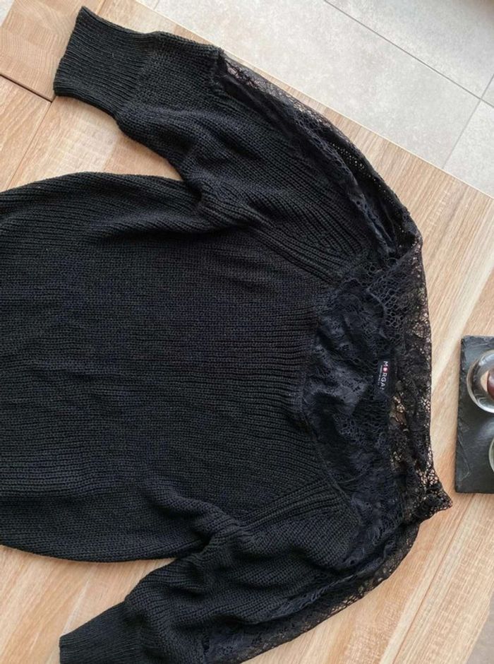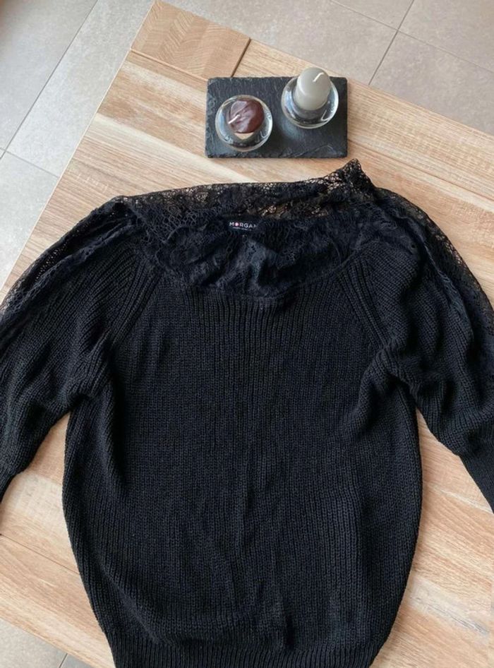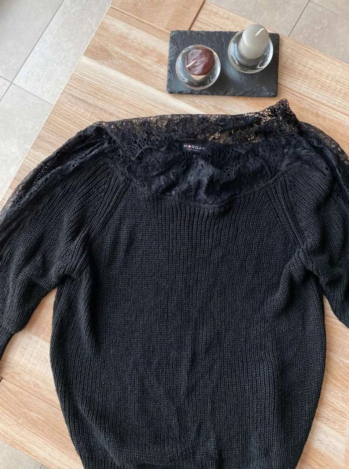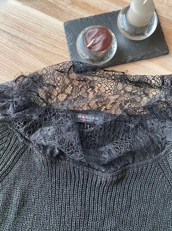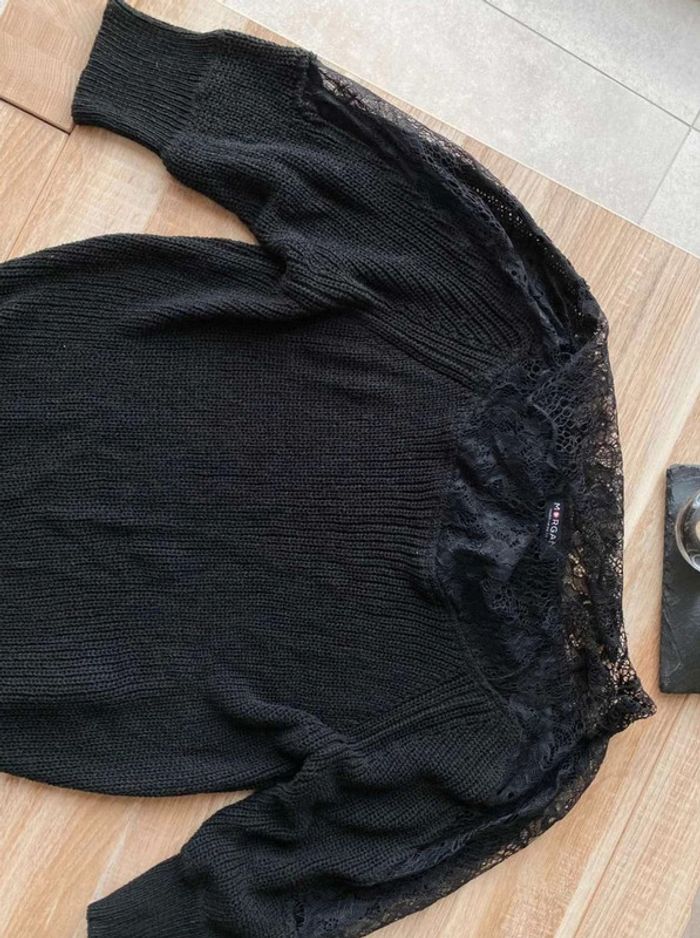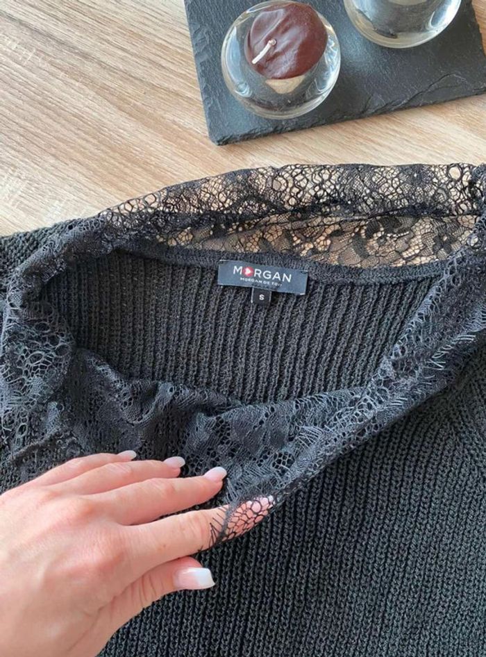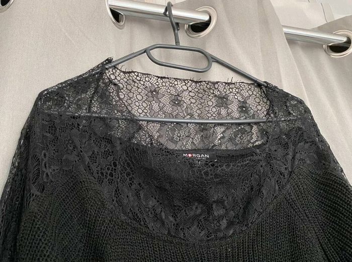 Pull noir Pull noir à dentelle Dentelle sur le col (devant + derrière) Dentelle sur les manches - manches plus amples (style chauve souris) Manches qui arrivent au niveau du coude Maille plutôt fini Pull uni noir avec beaucoup de dentelles Très bon état ⚠️ étiquette coupée à l’intérieur Taille S Marque Morgan 15€