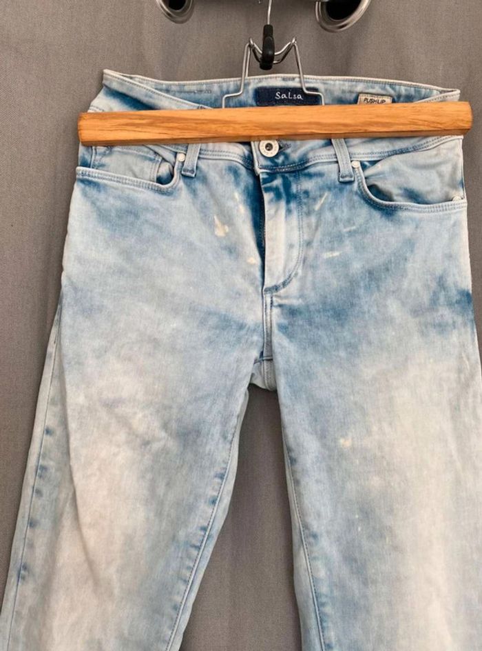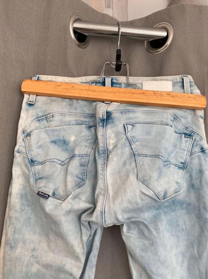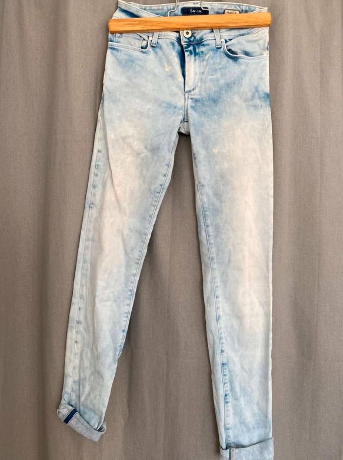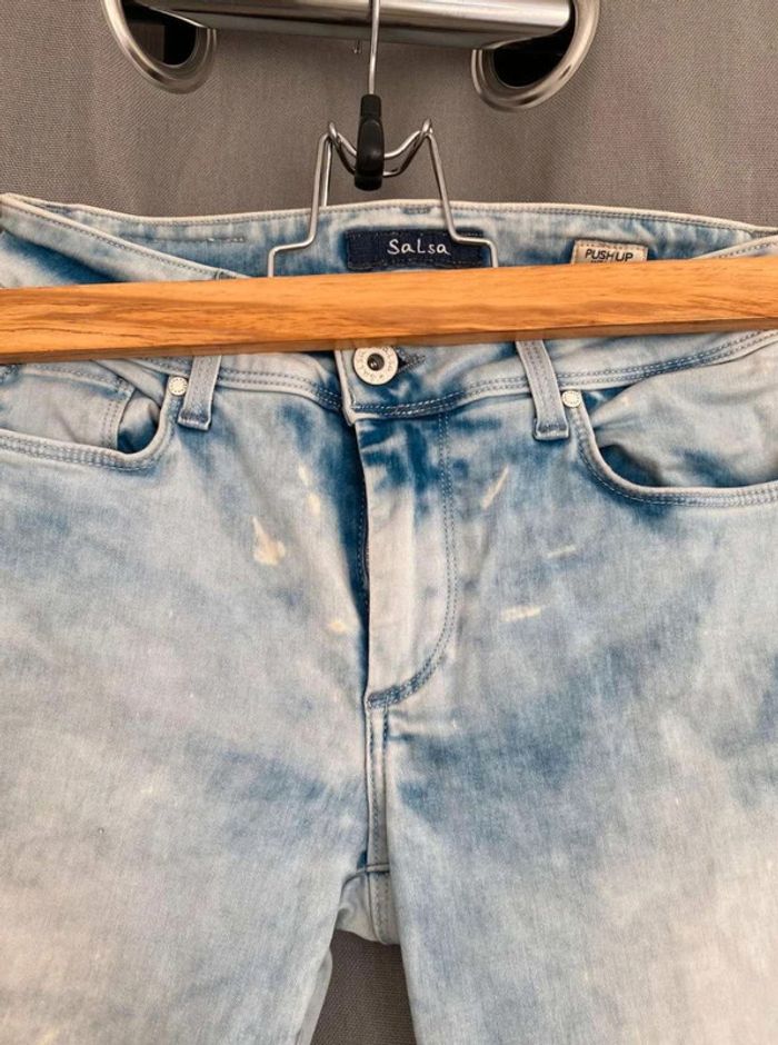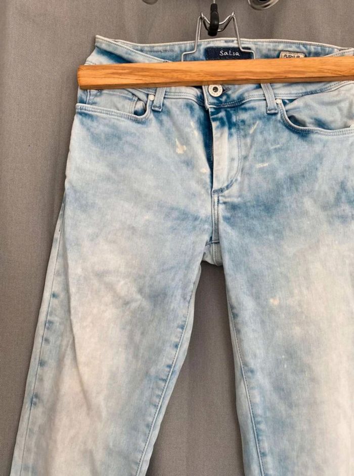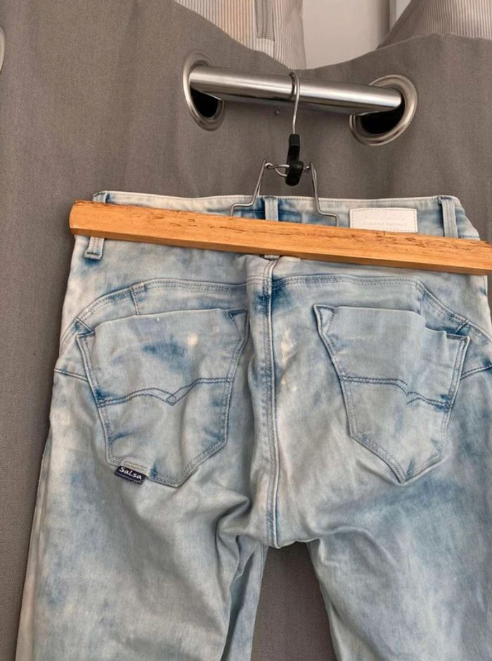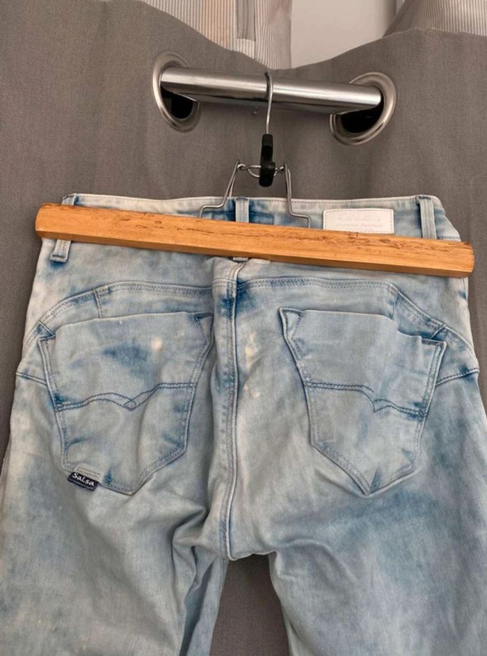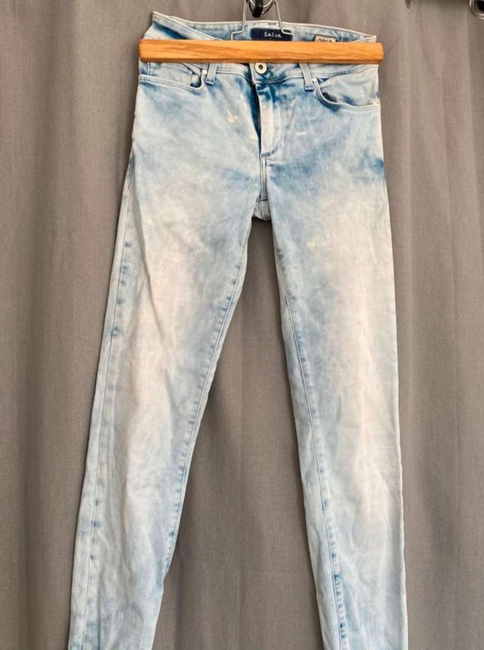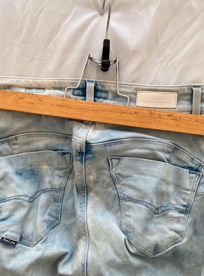 Jean Jean bleu très clair- et taches blanches Style vintage Jean près du corps / skinny ou slim Push up wonder Marque Salsa W27 L32 (taille 34/36) 20€