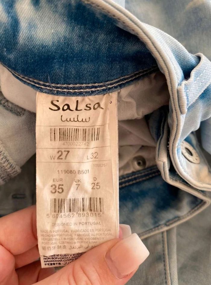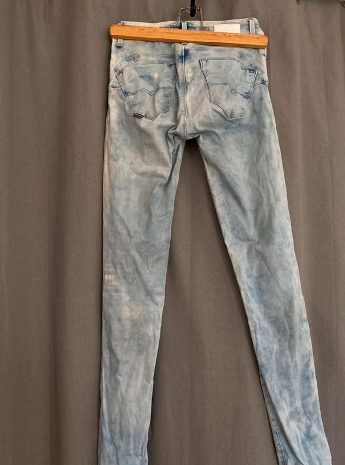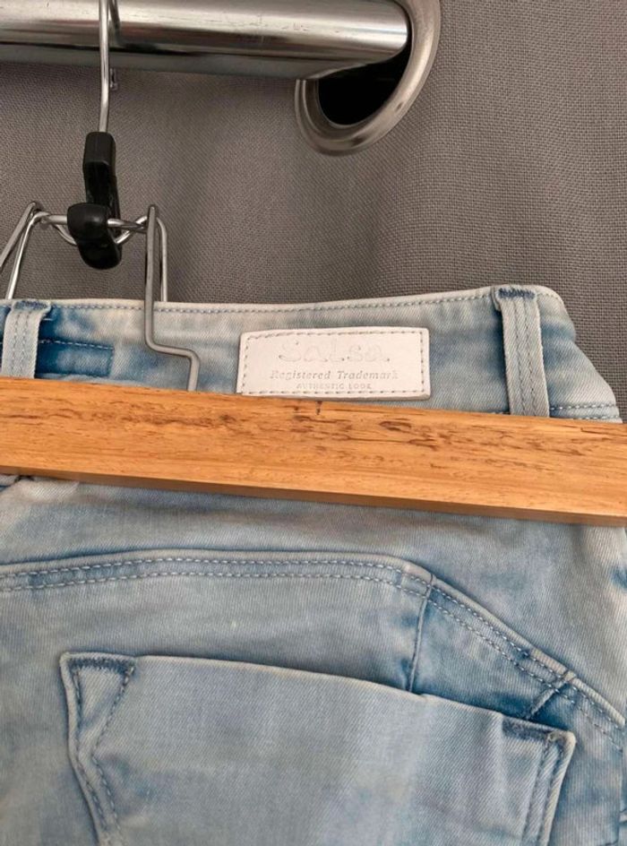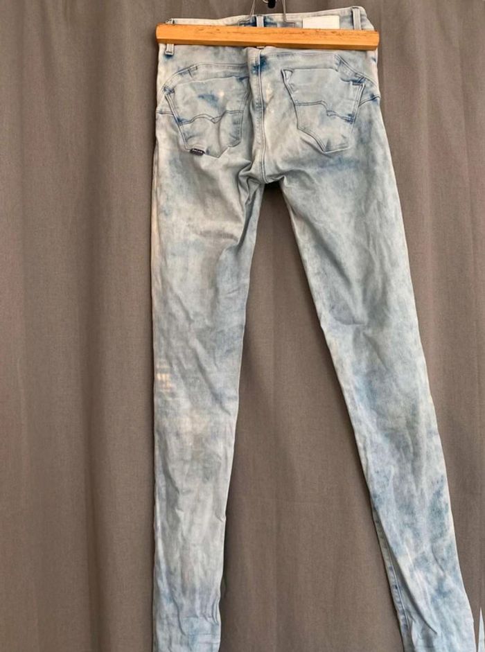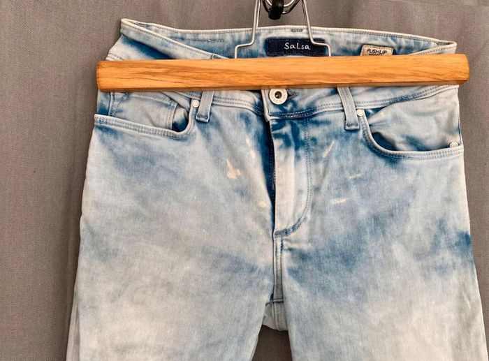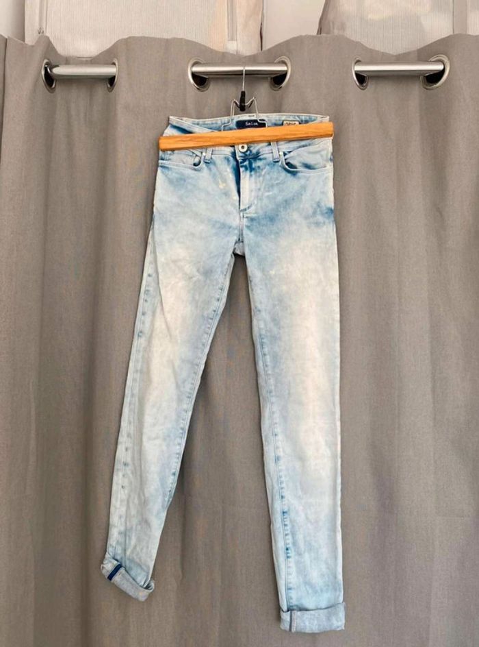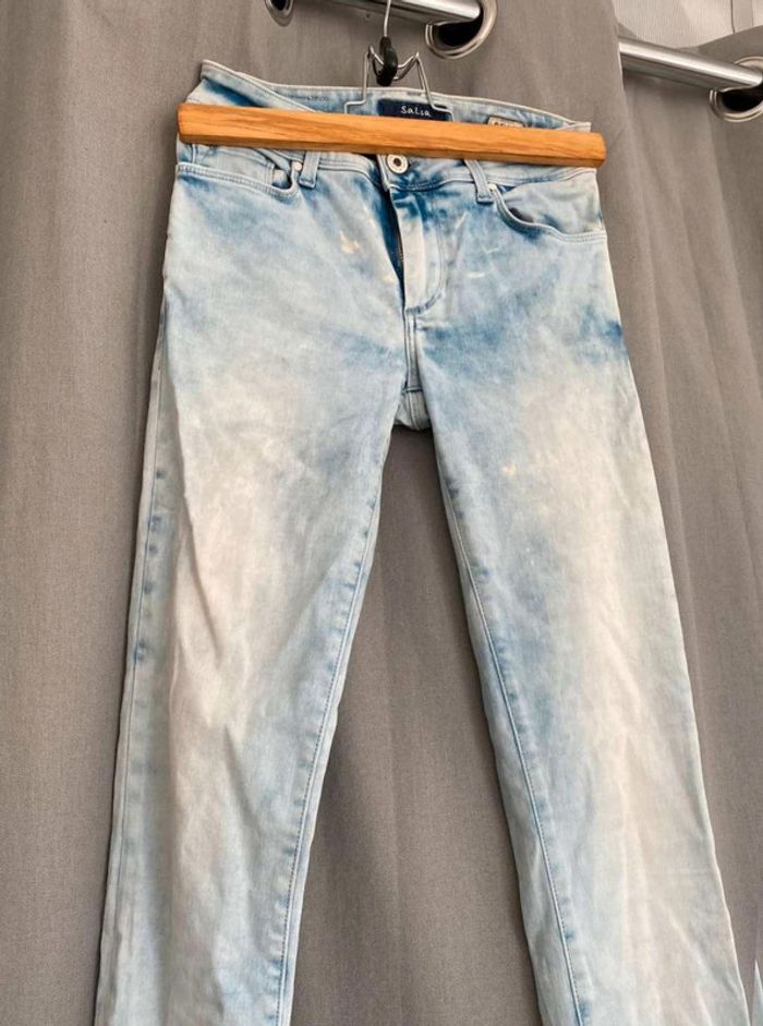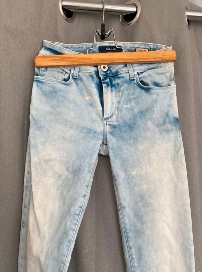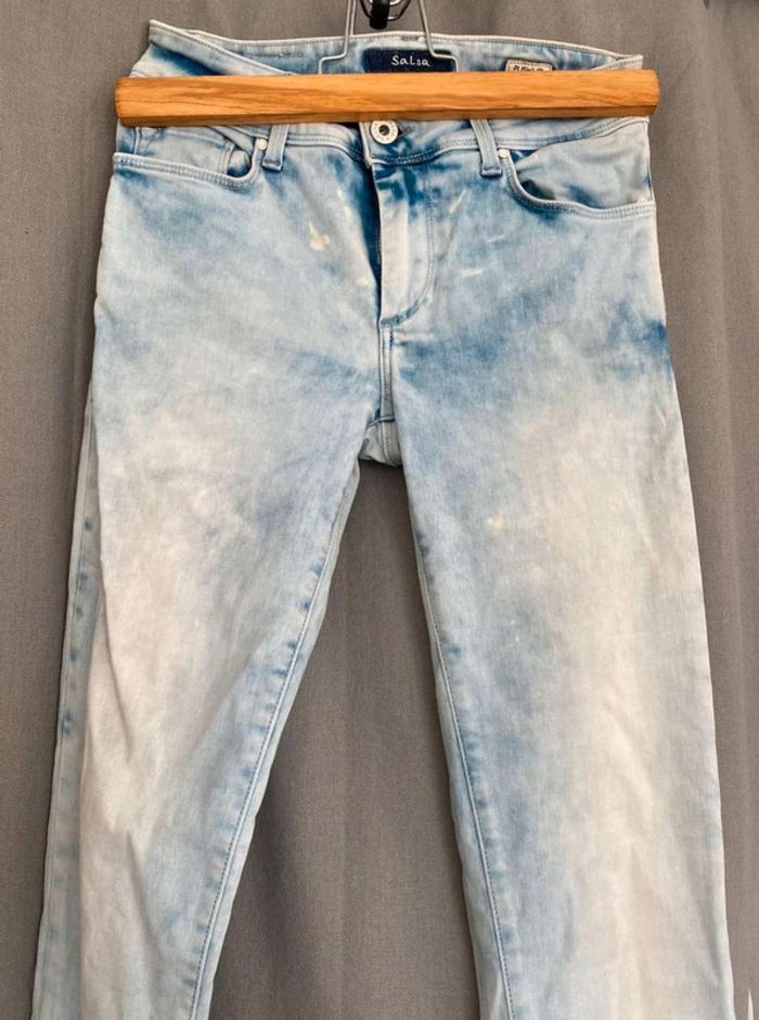 Jean Jean bleu très clair- et taches blanches Style vintage Jean près du corps / skinny ou slim Push up wonder Marque Salsa W27 L32 (taille 34/36) 20€