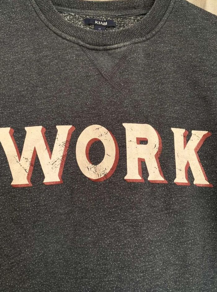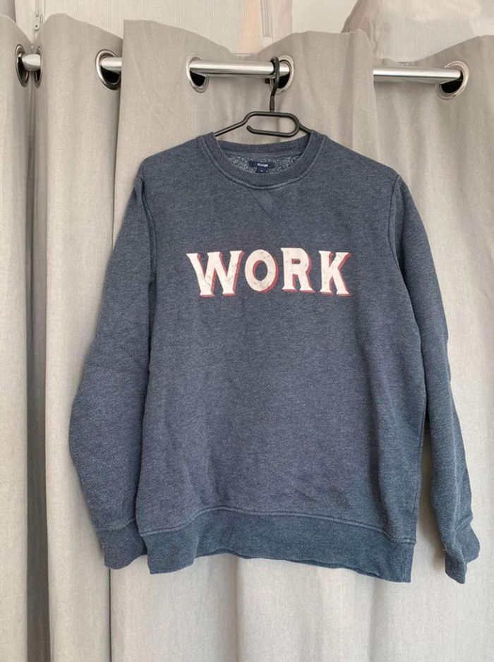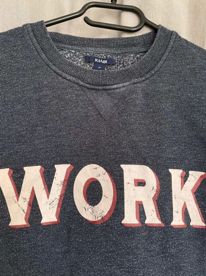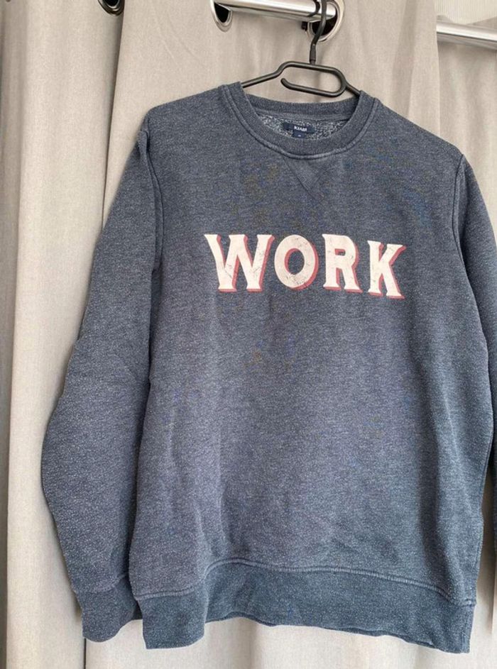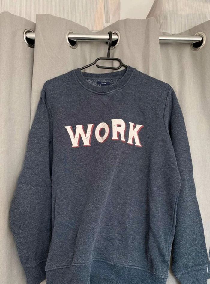 Sweat Sweat bleu avec écriture Work Porte de nombreuses fois, mais bon état (voir photos) Marque Kiabi Taille M 5€